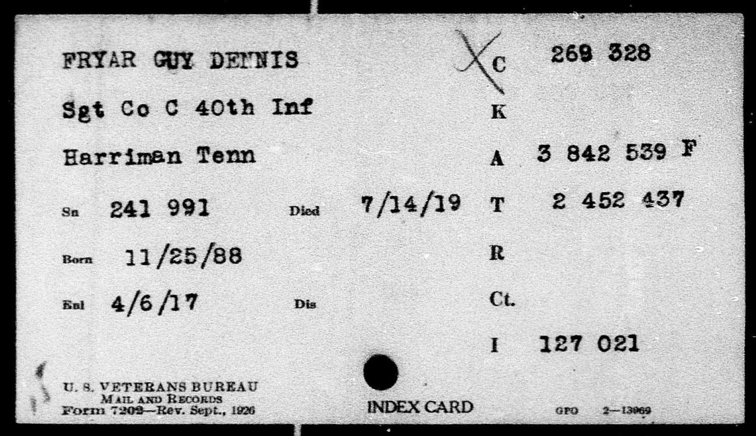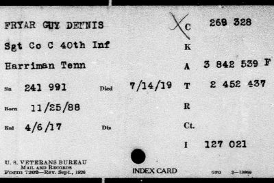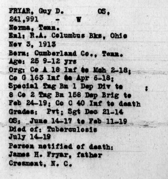Guy Dennis Fryar was the son of James Horace Fryar and Louinda Jane Sherrill. He enlisted on 3 November 1913