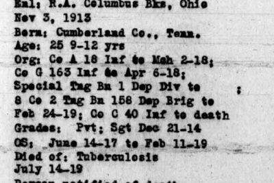 Died July 14, 1919 of Tuberculosis at the U.S. Army General Hospital at Oteen, North Carolina