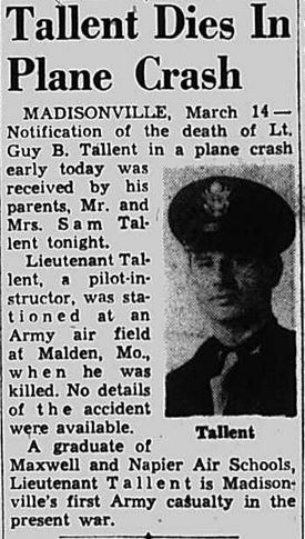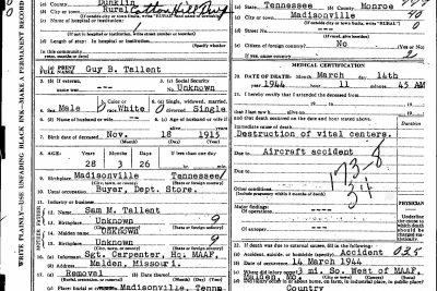 Word was received here on Tuesday by Mr. and Mrs. Sam M. Tallent that their son, First Lt. Guy B. Tallent, of the Army Air Corps, had been killed in an airplane accident at Malden Army Air Field, Malden, Mo. where he was in service as an instructor. Guy was 28 years of age. He was a graduate of Madisonville High School, Hiwassee College and the University of Tennessee. He had received training at Maxwell Field, AL, and received his wings at Napier Field in April, 1943. From reports, Lt. Tallent was up in a plane teaching an aviation cadet named McMasters, from Memphis, the principles of Army flying when the accident occurred. Cadet McMasters was also killed. The direct cause of the accident is not known.