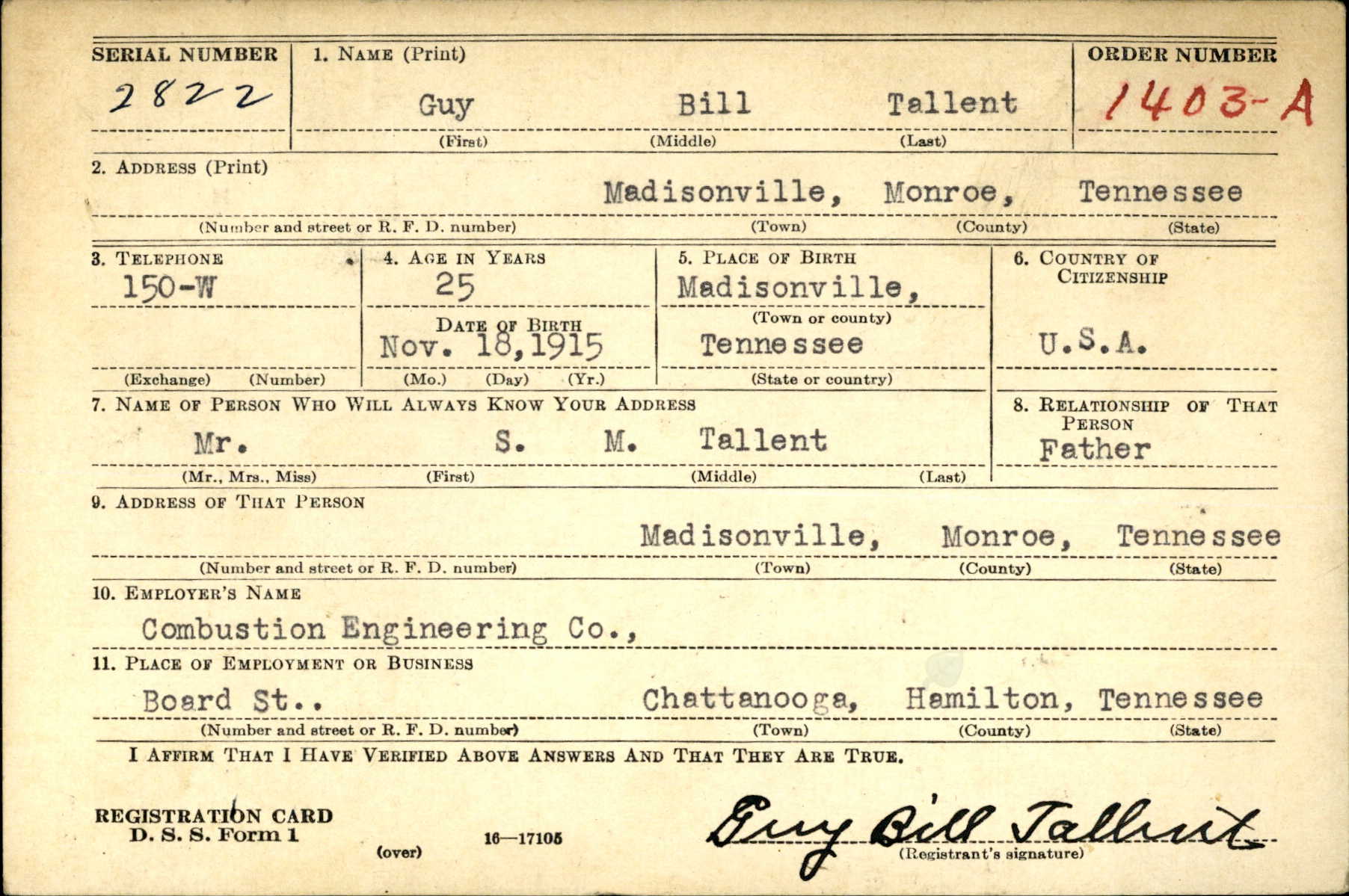 Guy had many friends here who receive the sad news of his untimely death with sincere grief. He is survived by his parents, four sisters, Mrs. T.O. Burleson and Mrs. Glen M. Swanson, Knoxville, Mrs. Aubrey Kyker, Sweetwater, and Mrs. Avery McCuistion of South Pittsburg, four brothers, Virgil Tallent, Madisonville, W.R. Tallent, Selma, AL, Charles R. of Dothan, AL, and A.C.K. Eugene Tallent of Shaw Field, Sumter, SC.