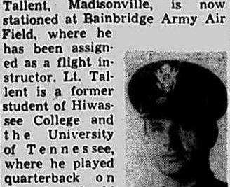 Lt. Guy B. Tallent, Madisonville, is now stationed at Bainbridge Army Air Field, where he has been assigned as a flight instructor. Lt. Tallent is a former student of Hiwassee College and the University of Tennessee, where he played quaterback on the football team. He is a son of Mr. and Mrs. S.M. Tallent and a brother of Mrs. G.M. Swanson, Fountain City.