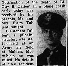 First Lieutenant Guy B. Tallent is killed in an airplane accident