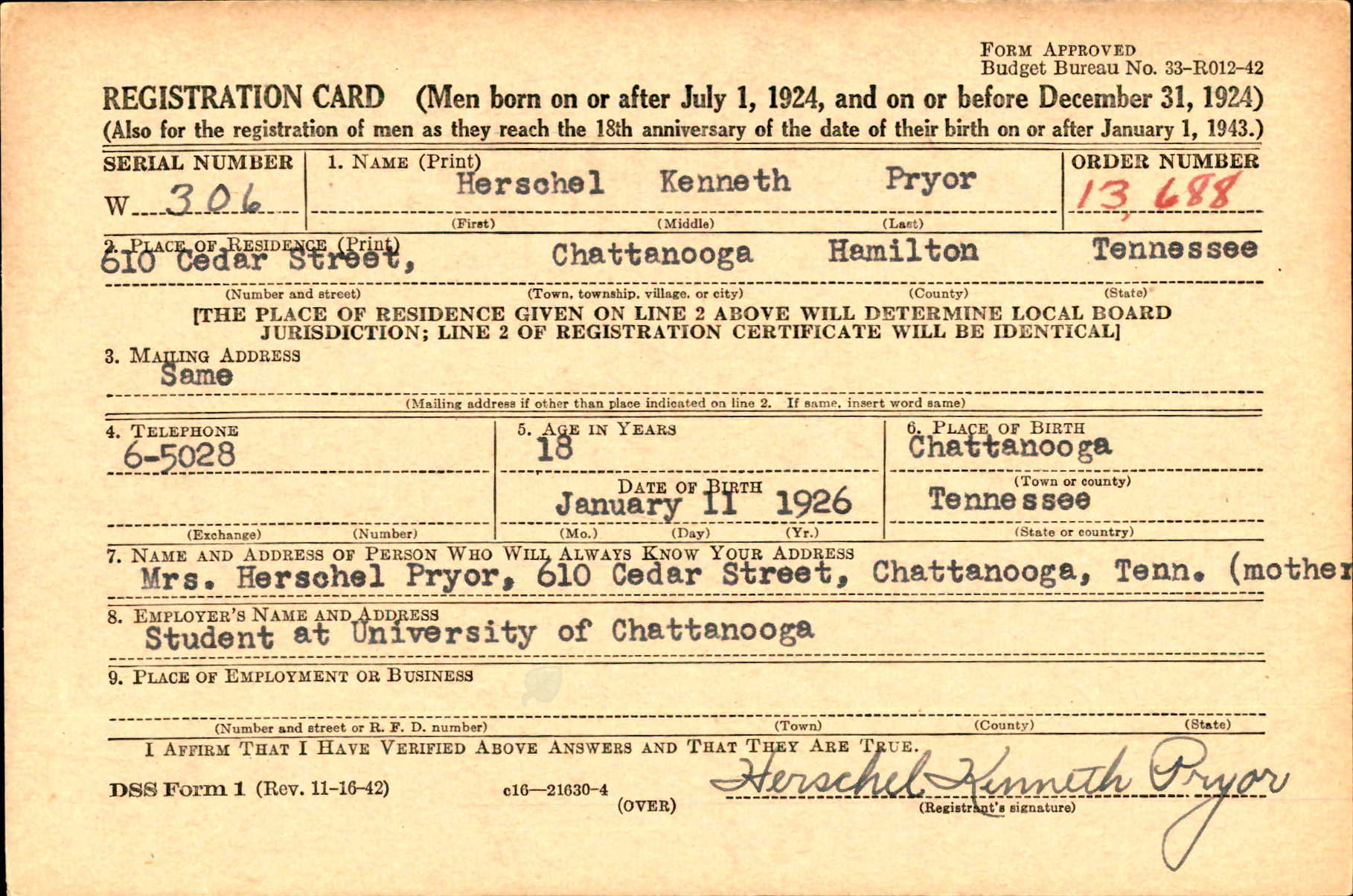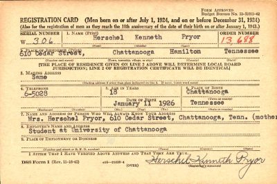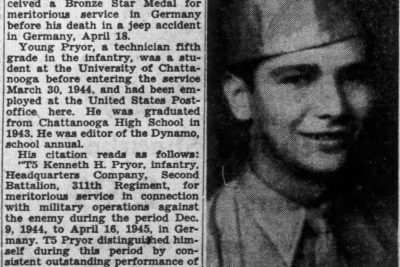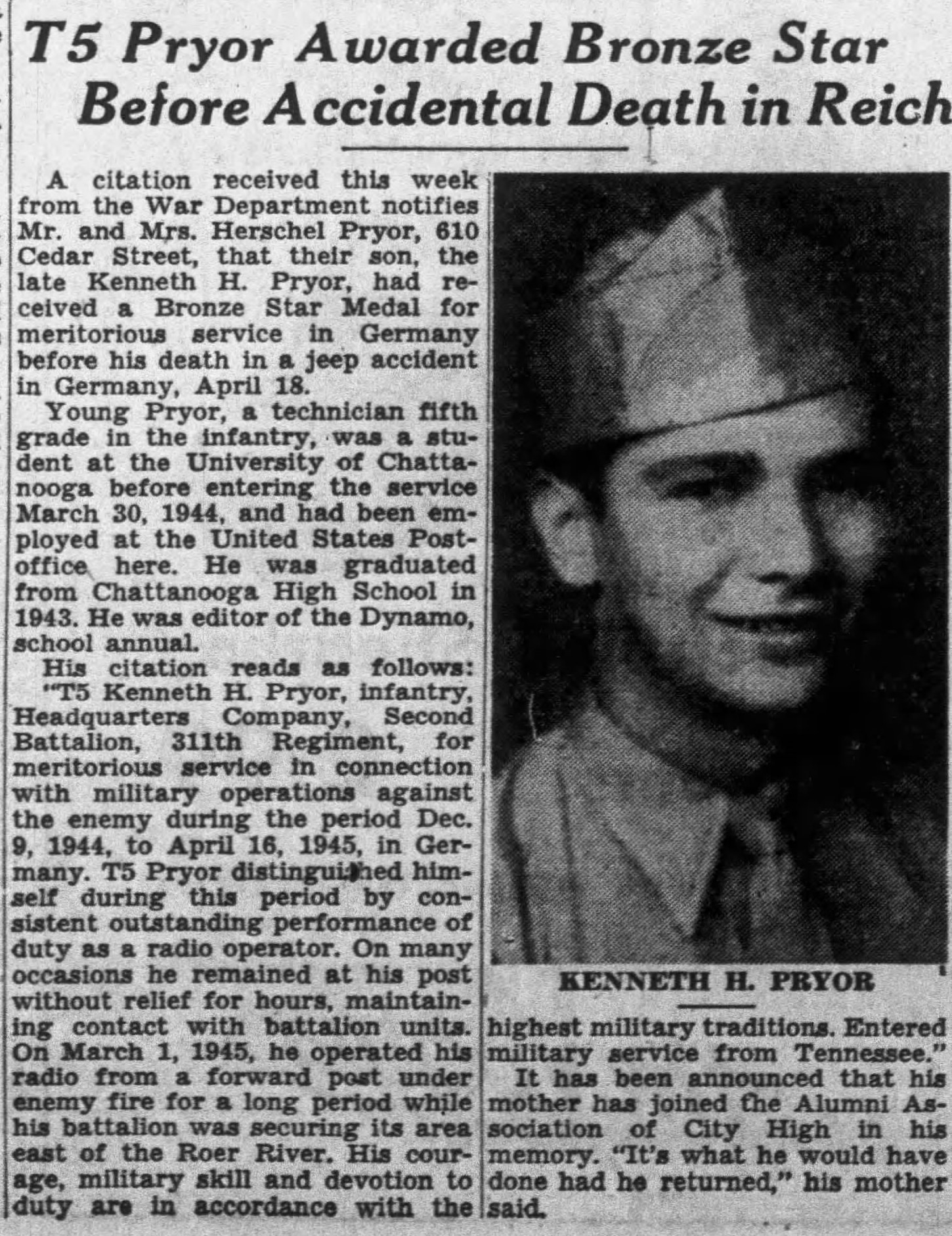 Young Pryor, a technician fifth grade in the infantry, was a student at the University of Chattanooga before entering the service March 30, 1944, and had been employed at the United States Post office here. He was graduated from Chattanooga High School in 1943. He was editor of the Dynamo school annual.
