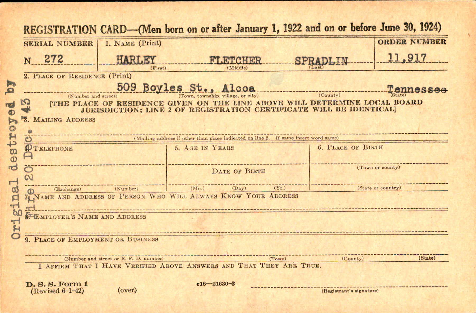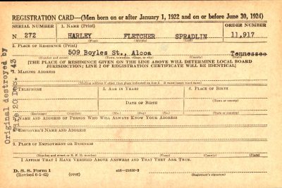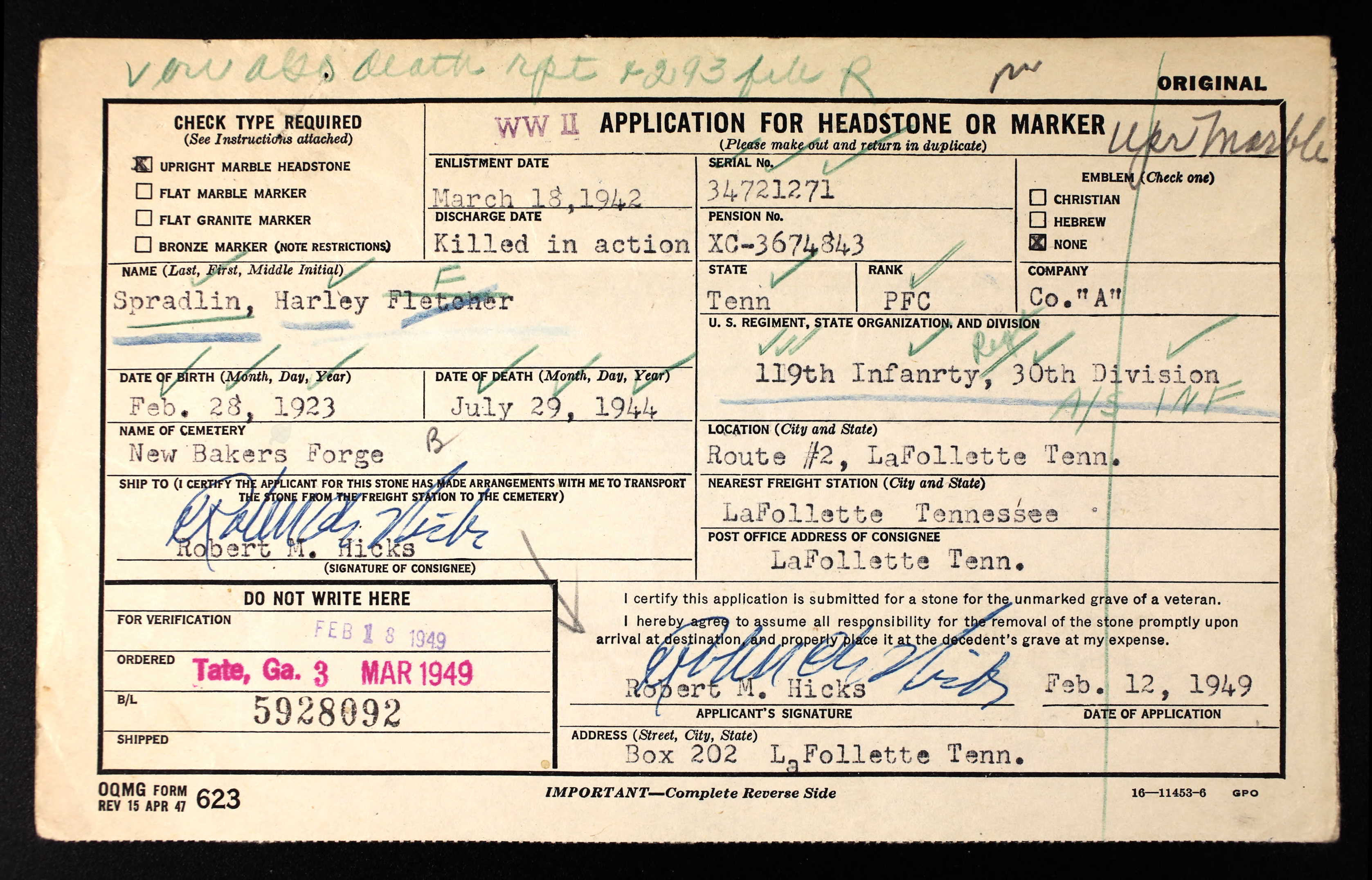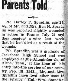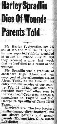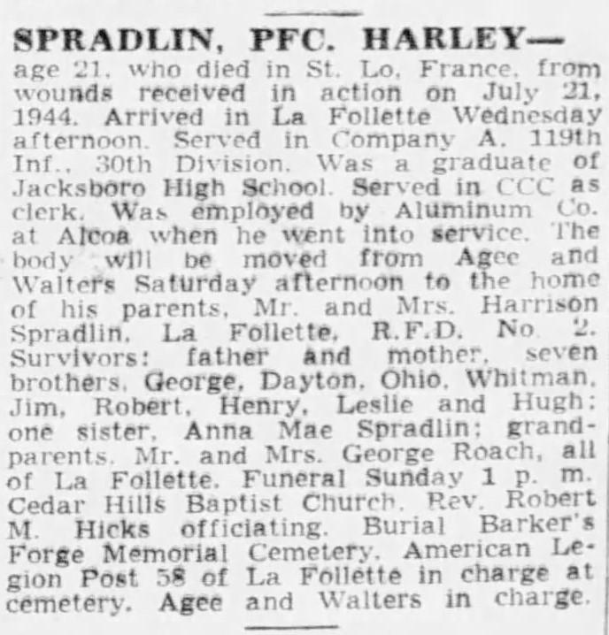 PFC. Harley Spradlin, age 21, who died in St. Lo, France, from wounds received in action on July 21, 1944, arrived in La Follette. Served in Company A, 119th Inf., 30th Division. He was a graduate of Jacksboro High School. Served in CCC as clerk. Was employed by Aluminum Co. at Alcoa when he went into service. The body will be moved from Agee and Walters to the home of his parents, Mr. and Mrs. Harrison Spradlin, La Follette, R.F.D. No. 2. Survivors, father and mother, seven brothers, George, Dayton, Ohio; Whitman, Jim, Robert, Henry, Leslie and Hugh; one sister, Anna Mae Spradlin; grandparents, Mr. and Mrs. George Roach, all of La Follette.