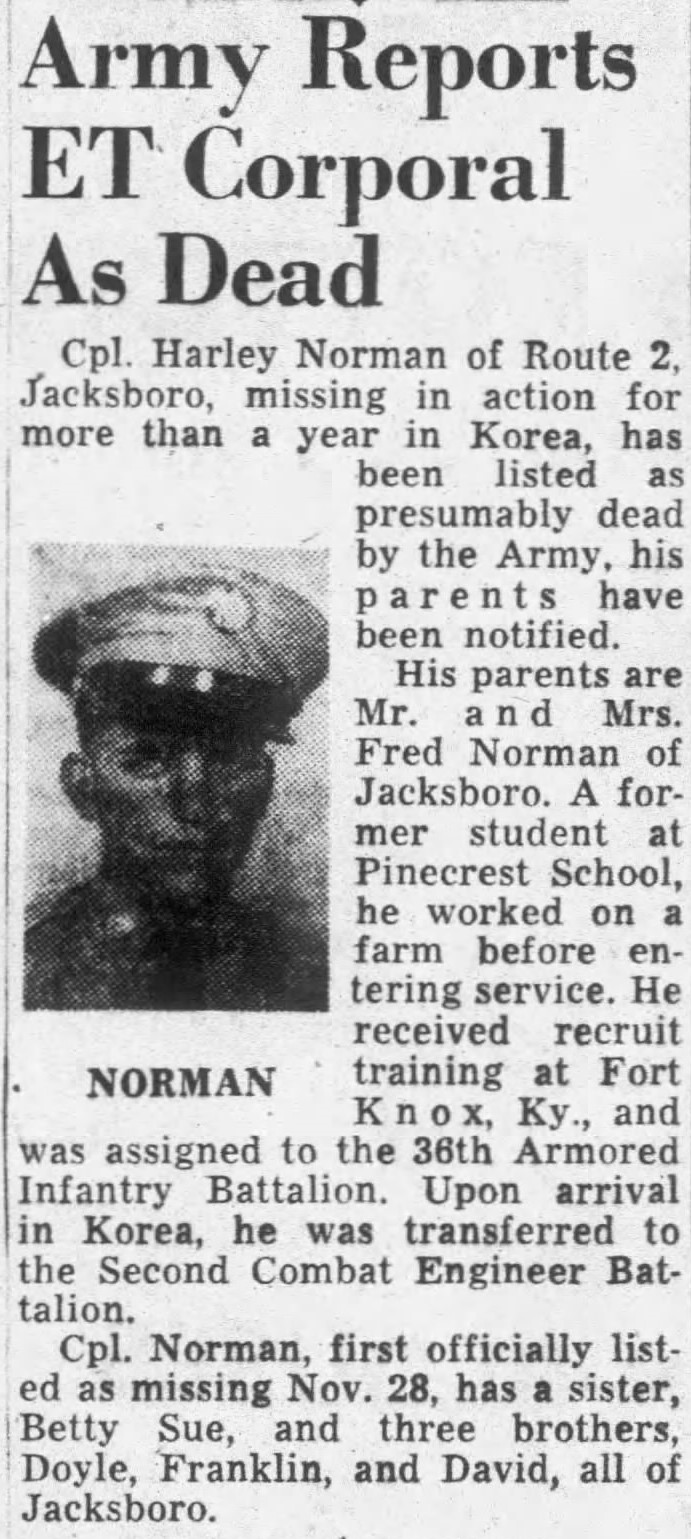 Cpl. Harley Norman of Route 2, Jacksboro, missing in action for more than a year in Korea, has been listed as presumably dead by the Army, his parents have been notified. His parents are Mr. and Mrs. Fred Norman of Jacksboro. A former student at Pinecrest School, he worked on a farm before entering service. He received recruit training at Fort Knox, Ky., and was assigned to the 36th Armored Infantry Battalion. Upon arrival in Korea, he was transferred to the Second Combat Engineer Battalion. Cpl. Norman has a sister, Betty Sue, and three brothers, Doyle, Franklin and David, all of Jacksboro.