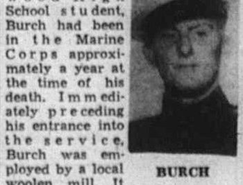 Daniel Burch, 23-year-old brother of the Marine, is in a Paris, France, hospital recovering from a wound received on the Italian front in November, 1944. Other survivors include the youth’s parents, a brother, Charles who is home, Mrs. Wyrick, a sister and also Miss Lorene Barbee, 2817 East Magnolia Avenue, fiancee of the Marine.