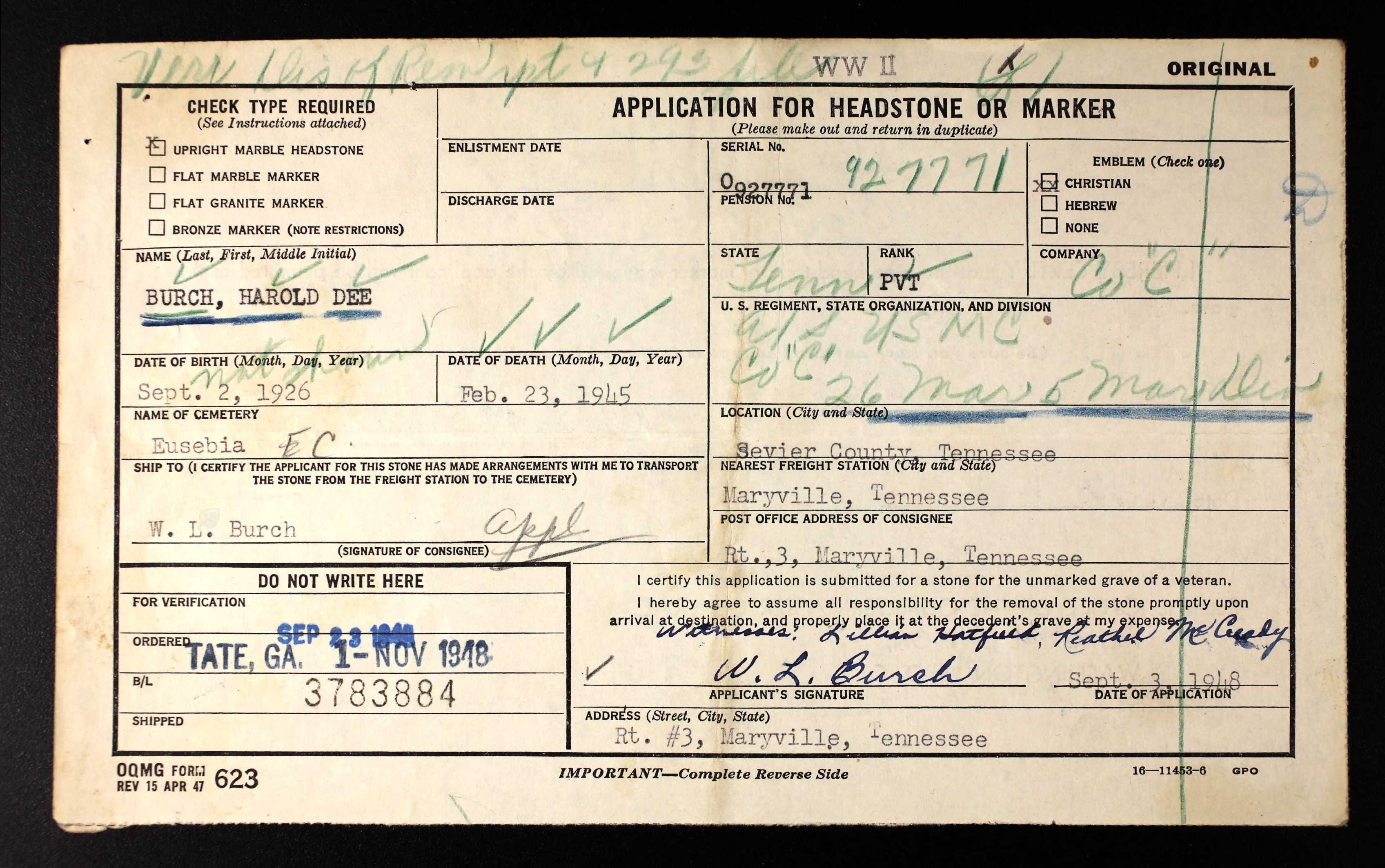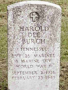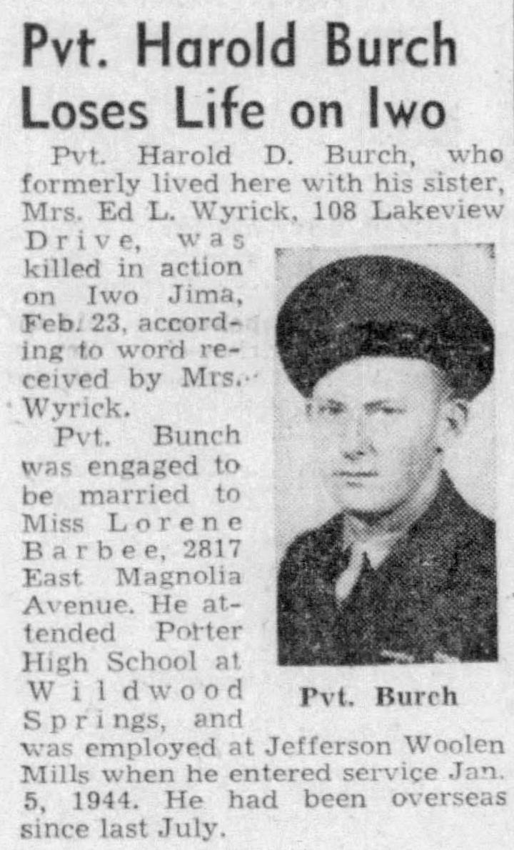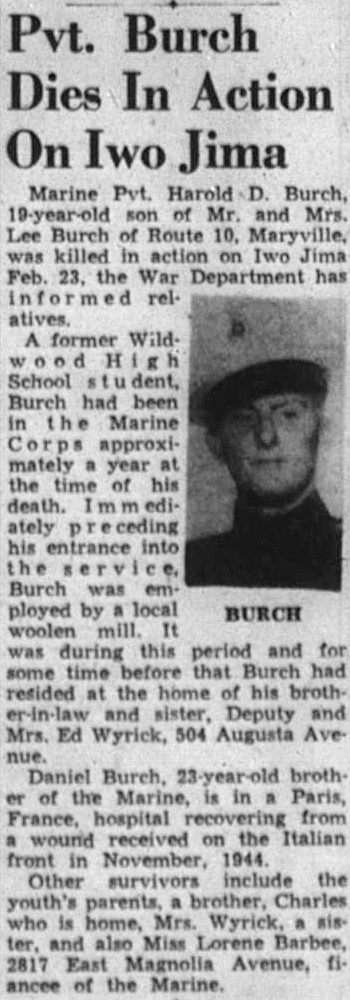 Marine Pvt. Harold D. Burch, 19-year-old son of Mr. and Mrs. Lee Burch of Route 10, Maryville, was killed in action on Iwo Jima, Feb. 23, the War Department has informed relatives. A former Wildwood High School student, Burch had been in the Marine Corps approximately a year at the time of his death. Immediately preceding his entrance into the service, Burch was employed by a local woolen mill. It was during this period and for some time before that Burch had resided at the home of his brother-in-law and sister, Deputy and Mrs. Ed Wyrick, 504 Augusta Avenue.