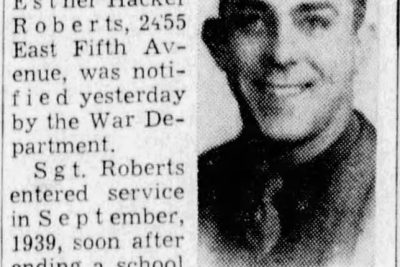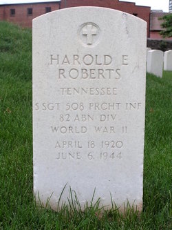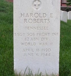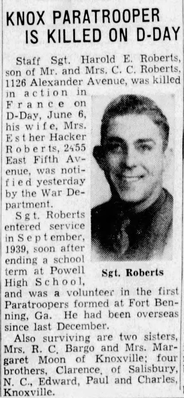 Staff Sgt. Harold E. Roberts, son of Mr. and Mrs. C.C. Roberts, 1126 Alexander Avenue, was killed in action in France on D-Day, June 6, his wife, Mrs. Esther Hacker Roberts, 2455 East Fifth Avenue, was notified yesterday by the War Department. Sgt. Robert entered service in September, 1939, soon after ending a school at Powell High School, and was a volunteer in the first Paratroopers formed at Fort Benning, Ga. He had been overseas since last December. Also surviving are two sisters, Mrs. R.C. Bargo and Mrs. Margaret Moon of Knoxville; four brothers, Clarence, of Salisbury, N.C., Edward, Paul and Charles, Knoxville.