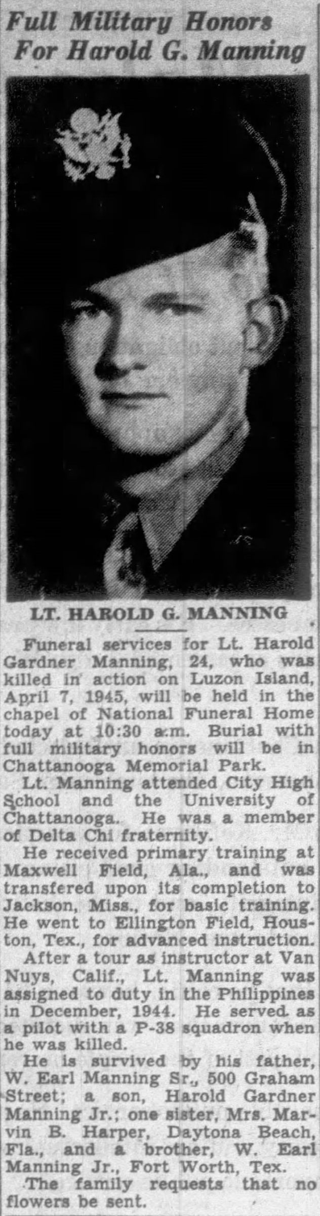 Funeral services for Lt. Harold Gardner Manning, 24, who was killed in action on Luzon Island April 7, 1945, will be held in the chapel of National Funeral Home. Burial with full military honors will be in Chattanooga Memorial Park.