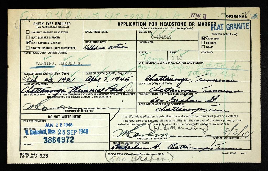 1st Lt Manning was inducted into the Army Air Corps on September 20, 1940 at Montgomery, Alabama. He served as a P-38 Lightning Fighter Pilot assigned to the 36th Fighter Squadron, 8th Fighter Group, attached to the 36th Fighter Squadron, 8th Fighter Group, attached to the V-interceptor Command, US far East 5th Air Force. His Squadron was stationed at San Jose, Mindoro airfield in the Philippine Islands. He died in a non-combat related aviation accident and was buried in a battlefield cemetery in the Philippine Islands. After the cessation of histilities with Japan his remains were returned to his county and family with interment in the Chattanoooga Memorial Park Cemetery, Chattanooga, Tennessee.