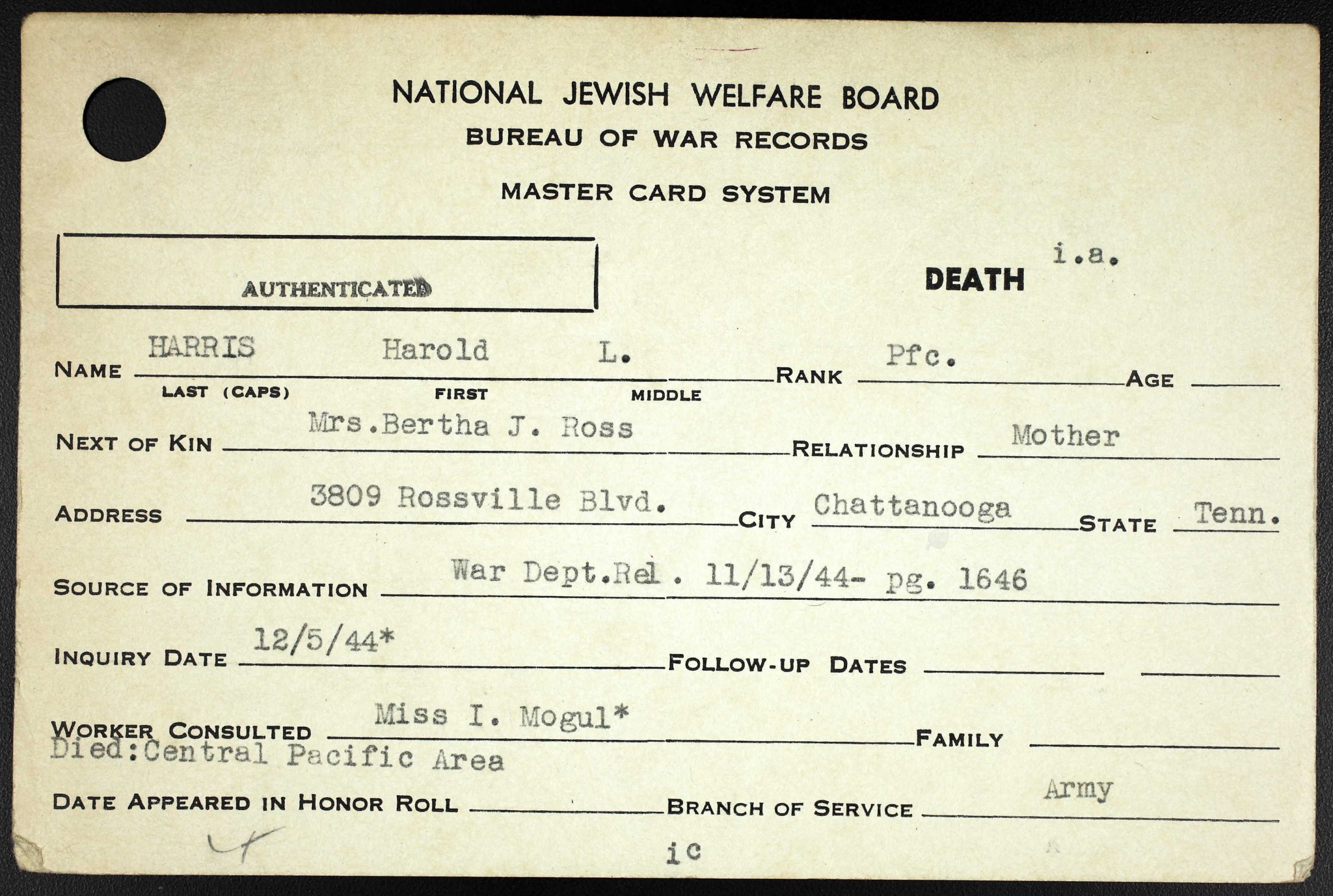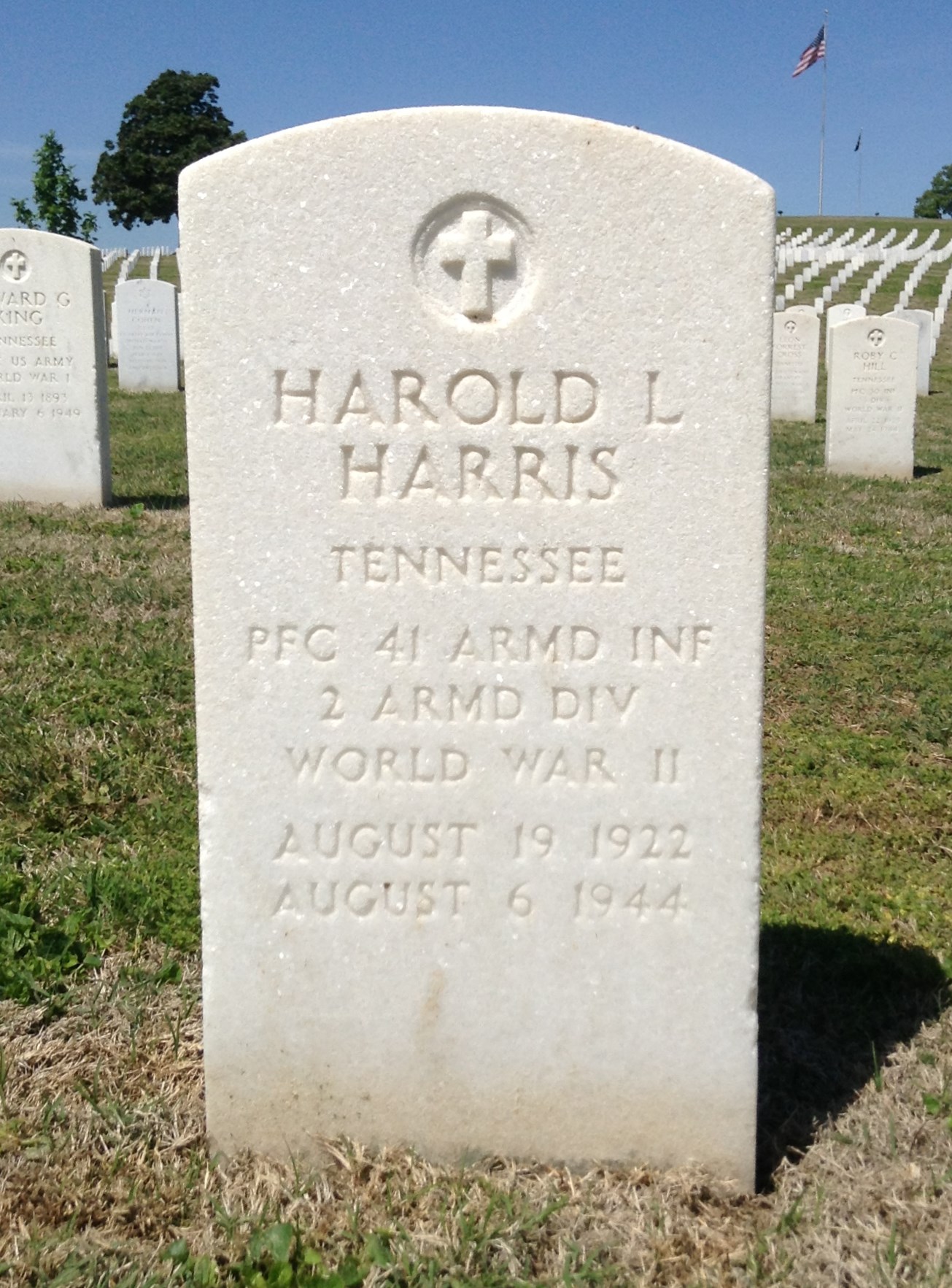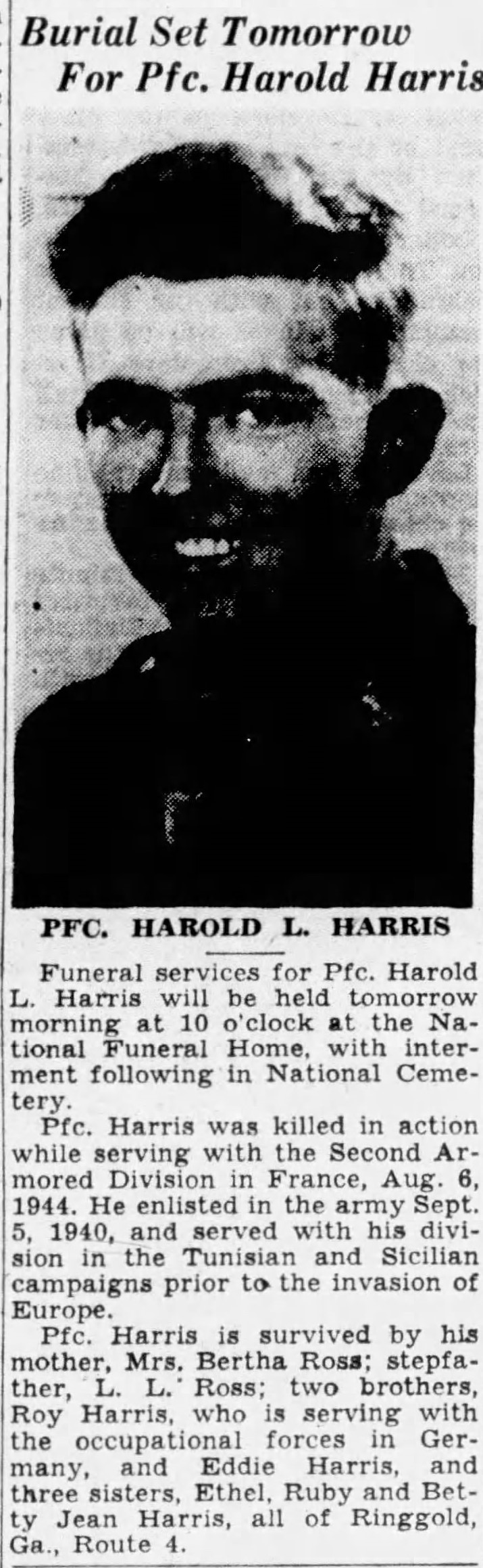 Funeral services for Pfc. Harold L. Harris will be held tomorrow morning at the National Funeral Home, with interment following in National Cemetery. Pfc. Harris was killed in action while serving with the Second Armored Division in France, Aug. 6, 1944. He enlisted in the army Sept. 5, 1940, and served with his division in the Tunisian and Sicilian campaigns prior to the invasion of Europe. Pfc. Harris is survived by his mother, Mrs. Bertha Ross; stepfather, L.L. Ross; two brothers, Roy Harris, who is serving with the occupational forces in Germany, and Eddie Harris, and three sisters, Ethel, Ruby and Betty Jean Harris, all of Ringgold, Ga., Route 4.
