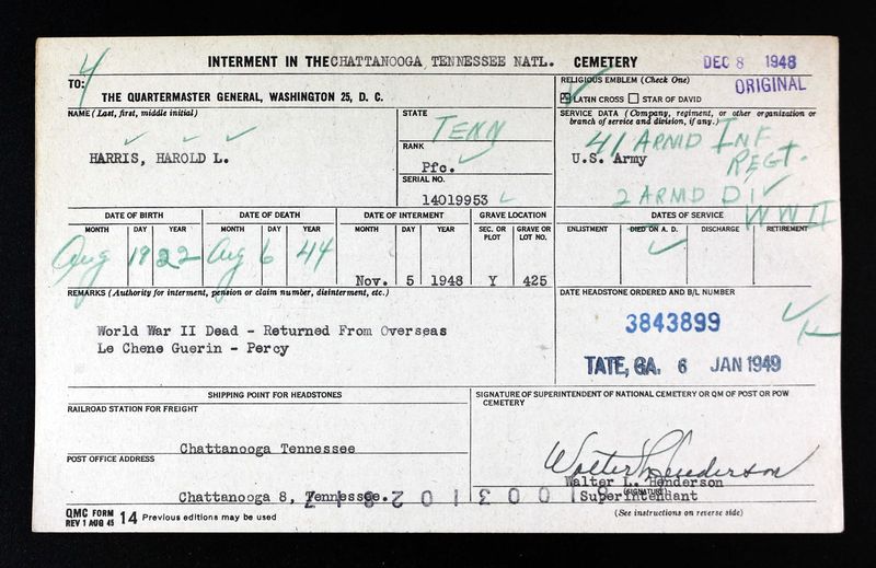 PFC Harris was returned from Le Chêne Guérin U.S. Military Cemetery, Percy, France.