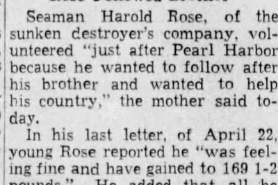Seaman Harold Rose, of the sunken destroyer’s company, volunteered “Just after Pearl harbor because he wanted to follow after his brother and wanted to help his country,” the mother said today. In his last letter, of April 22, young Rose reported he “was feeling fine and have gained to 69 1-2 pounds.” He added that all he could say about the whereabouts was that he was almost 3000 miles from homeland. The other son, Petty Officer Luther H. Rose, who is only 19, enlisted 22 monts ago and is stationed at an East Coast naval air base.