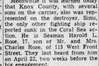 It was learned today that Knox County, with several sons on the carrier, was represented on the destroyer, Sims, the only other fighting ship reported sunk in the Coral Sea action. He is Seaman Harold L. Rose, 17, son of Mr. and Mrs. Charles Rose of 113 West Front Street. They last heard from him on April 22, two weeks before the big engagement.