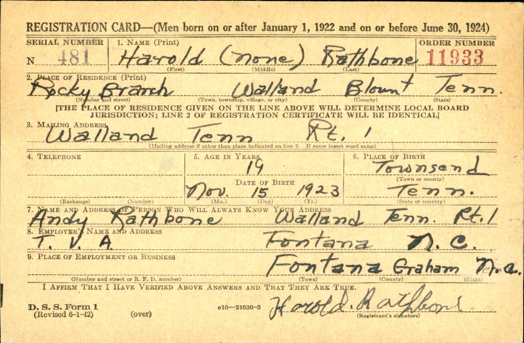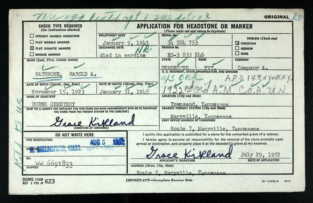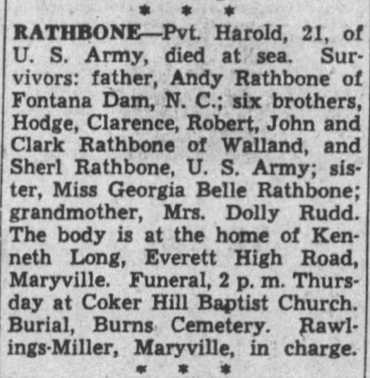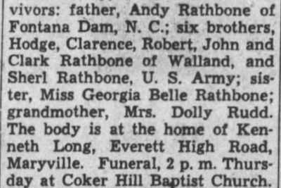 Son of Andrew Miles “Andy” Rathbone and Mary Elizabeth Rudd. He was survived by six brothers, Hodge, Clarence, Robert, John and Clark Rathbone of Walland, and Sherl Rathbone, U.S. Army; sister, Miss Georgia Belle Rathbone; grandmother, Mrs. Dolly Rudd.