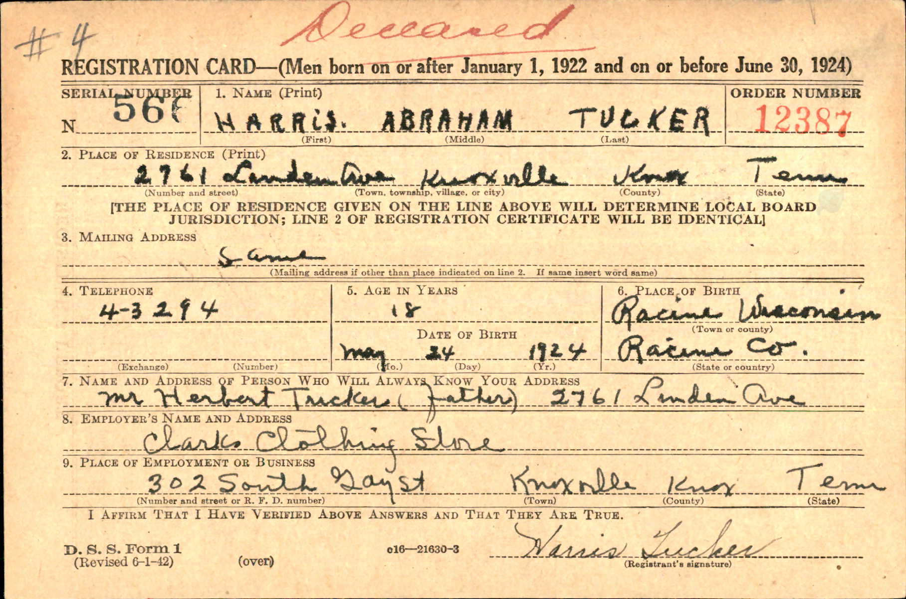 Harris Abraham Tucker was born in Wisconsin, the son of Herbert Aaron Tucker and Edna Celene Shuck.