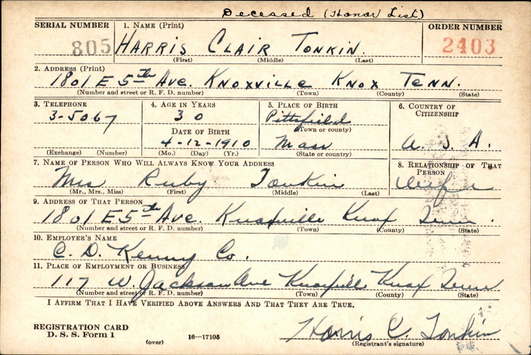 Harris Claire Tonkin was born on 12 April 1910 in Pittsfield, Massachusetts. He was the son of William James Tonkin and Cassandra Van Alen. He had an older brother William Van Alen Tonkin, a younger sister, Ellen Daisy Tonkin and a younger brother, Ralph Rigdon Tonkin. Harris was married to Ruby Bundren and father of Harris Duane (Bud) Tonkin and Julia Clair Tonkin. Sgt Tonkin attended Knoxville High School and enlisted on December 7, 1942 in Fort Oglethorpe, GA.