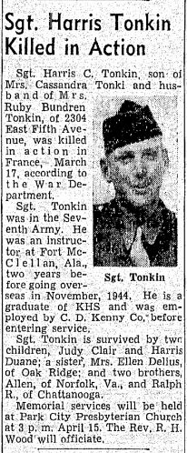Sgt. Harris C. Tonkin, son of Mrs. Cassandra Tonkin and husband of Mrs. Ruby Bundren Tonkin, of 2304 East Fifth Avenue, was killed in action in France, March 17, according to the War Department. Sgt. Tonkin was in the Seventh Army. He was an instructor at Fort McClellan, Ala., two years before going overseas in November, 1944. He is a graduate of KHS and was employed by C.D. Kenny Co., before entering service. Sgt. Tonkin is survived by two children, Judy Clair and Harris Duane; a sister, Mrs. Ellen Delius of Oak Ridge; and two brothers, Allen of Norfolk, Va., and Ralph R., of Chattanooga.