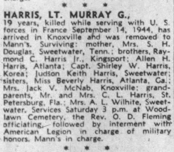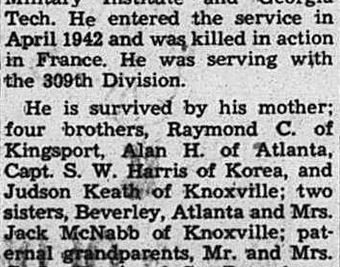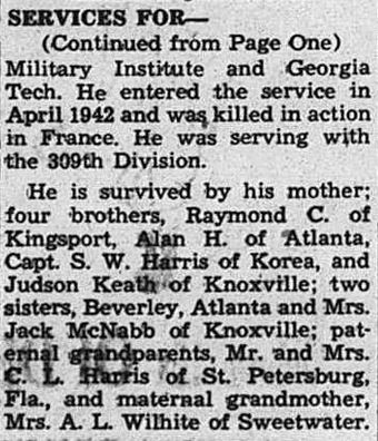 He entered the service in April 1942 and was Killed in Action in France. He was serving with the 80th Division.