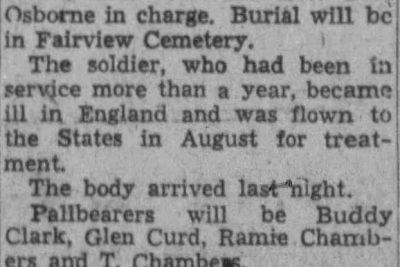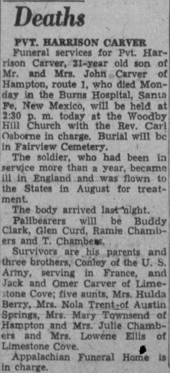 Funeral services for Pvt. Harrison Carver, 21-year old son of Mr. and Mrs. John Carver of Hampton, route 1, who died Monday in the Burns Hospital, Santa Fe, New Mexico, will be held at the Wodoby Hill Church. Burial will be in Fairview Cemetery. The soldier, who had been in service more than a year, became ill in England and was flown to the States in August for treatment.
