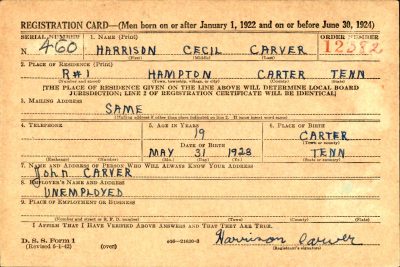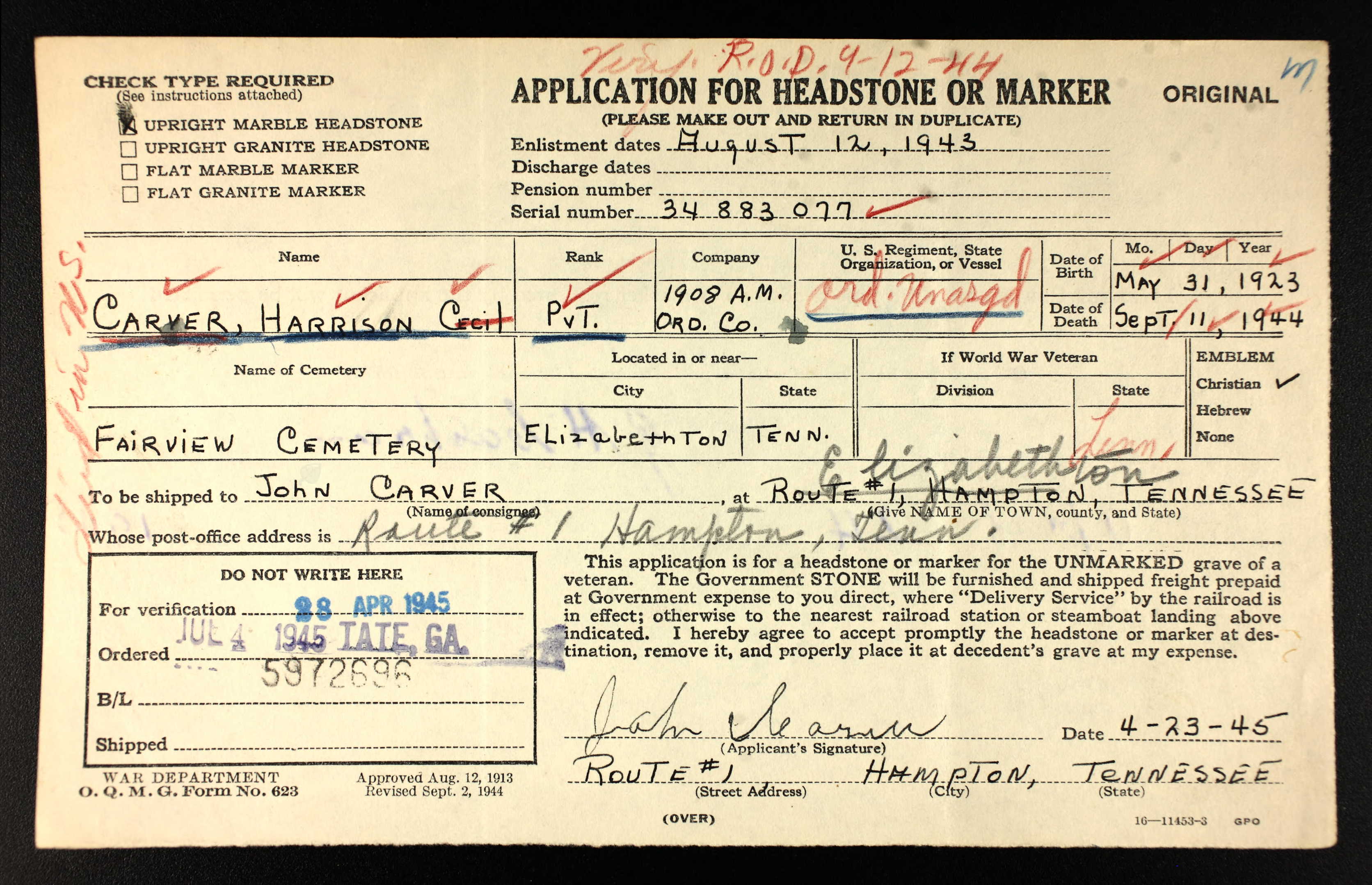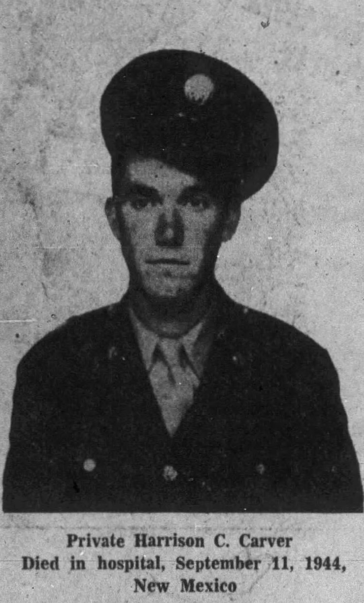 Harrison Cecil Carver was born 31 May 1923 to John H. Carver and Bettie J. Moore. He died non Battle 11 September 1944 in a hospital in Santa Fe, New Mexico. Pvt. Carver went into the service August 5, 1943, and was with an Infantry outfit in England before being returned to New Mexico.
