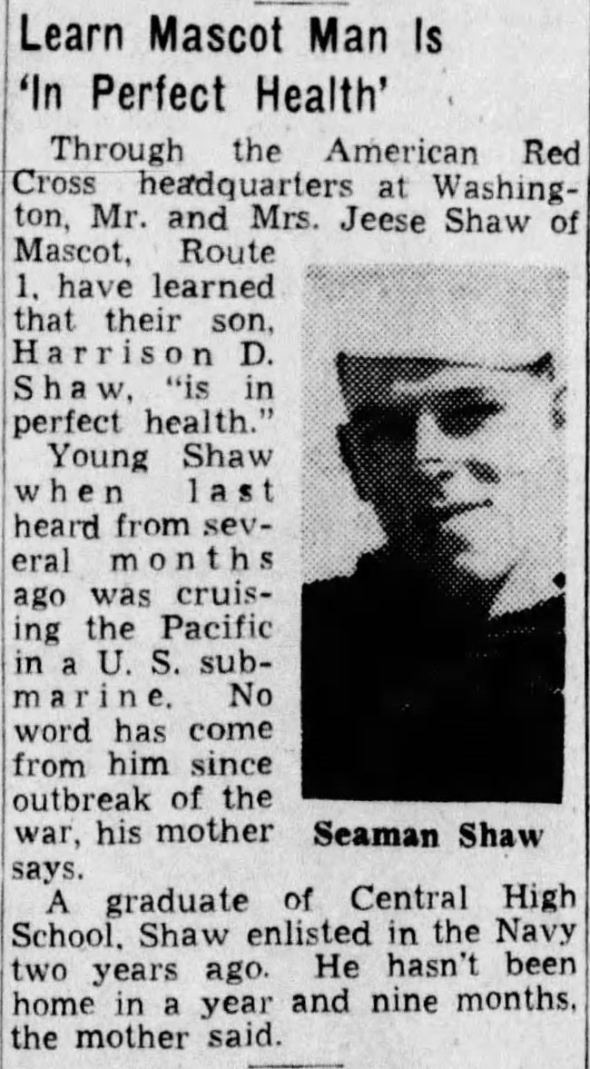 Through the American Red Cross headquarters at Washington, Mr. and Mrs. Jesse Shaw of Mascot, Route 1, have learned that their son, Harrison D. Shaw, “is in perfect health.”Young Shaw when last heard from serveral months ago was cruising the Pacific in a U.S. Submarine. No word has come from him since outbreak of the war, his mother says. A graduate of Central High School, Shaw enlisted in the Navy two years ago. He hasn’t been home in a year and nine months the mother said.