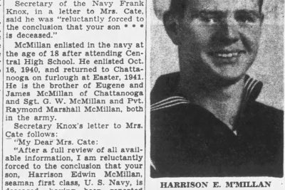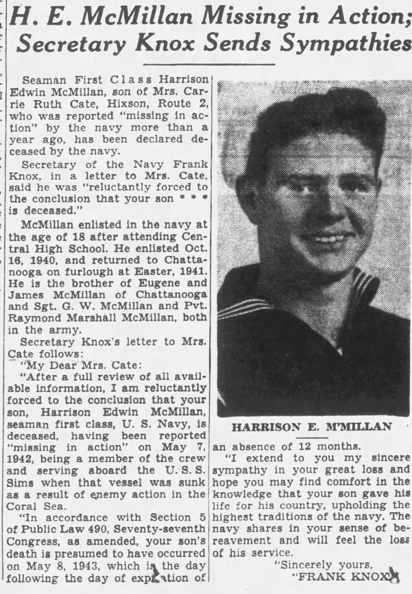 Seaman First Class Harrison Edwin McMillan, son of Mrs. Carrie Ruth Cate, Hixon, Route 2, who was reported “missing in action” by the Navy more than a year ago, has been declared deceased. Secretary of the Navy Frank Knox, in a letter to Mrs. Cate, said he was “reluctantly forced to the conclusion that your son*** is deceased.”