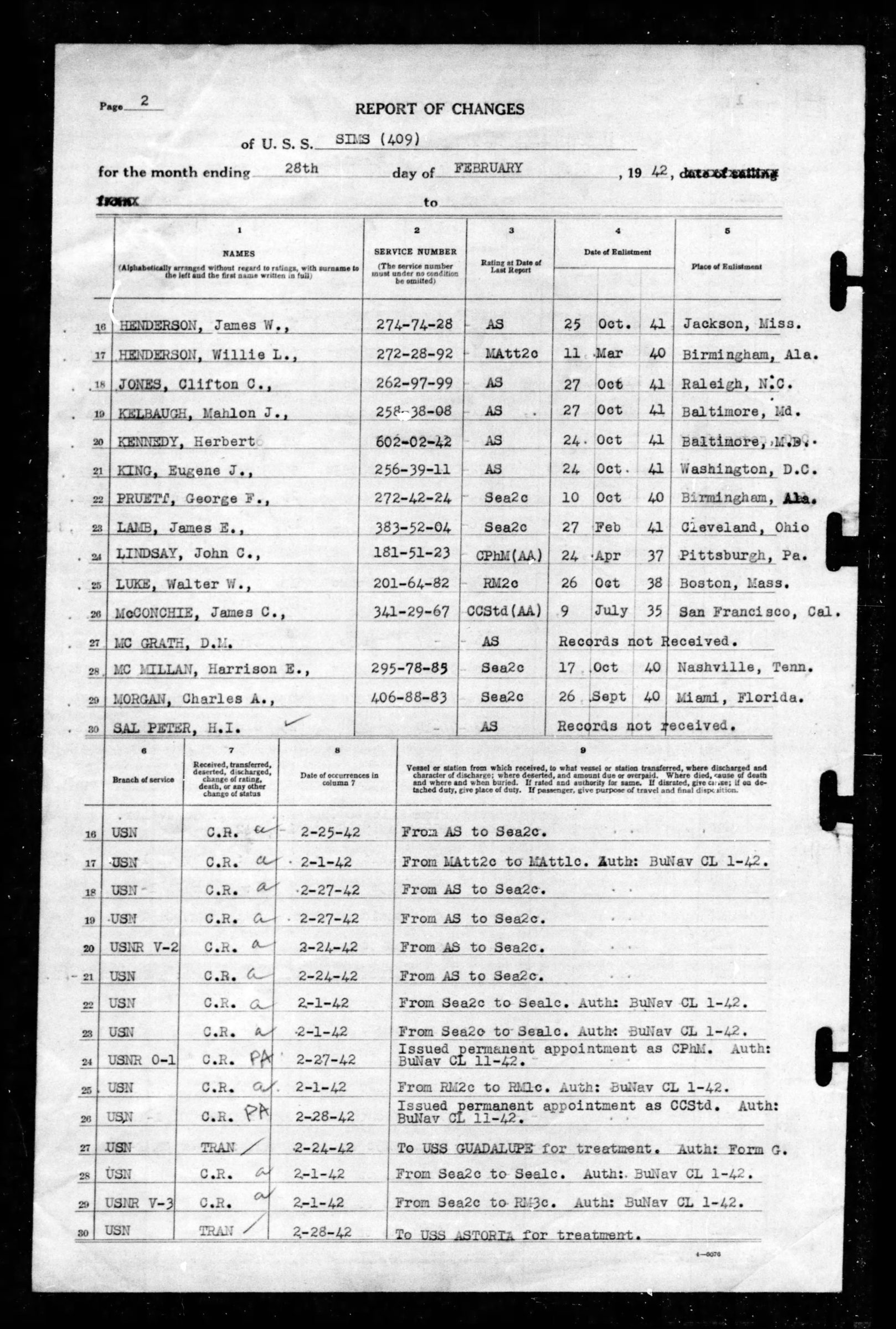 Asfter a full review of all available information, I am reluntantly forced to the conclusion that your son, Harrison Edwin McMillan, seaman first class, U.S. Navy, is deceased, having been reported “missing in action” on May 7, 1942, being a member of the crew and serving aboard the U.S.S. Sims when that vessel was sunk as a result of enemy action in the Coral Sea. In accordance with Section 5 of Public Law 490, Seventy-seventh Congress, as amended, your son’s death is presumed to have occurred on May 8, 1943, which is the day following the day of expiration of an absence of 12 months. I extend to you my sincere sympathy in your great loss and hope you may find comfort in the knowledge that your son gave his life for his country, upholding the highest traditions of the Navy. The Navy shares in your sense of bereavement and will feel the loss of his service.