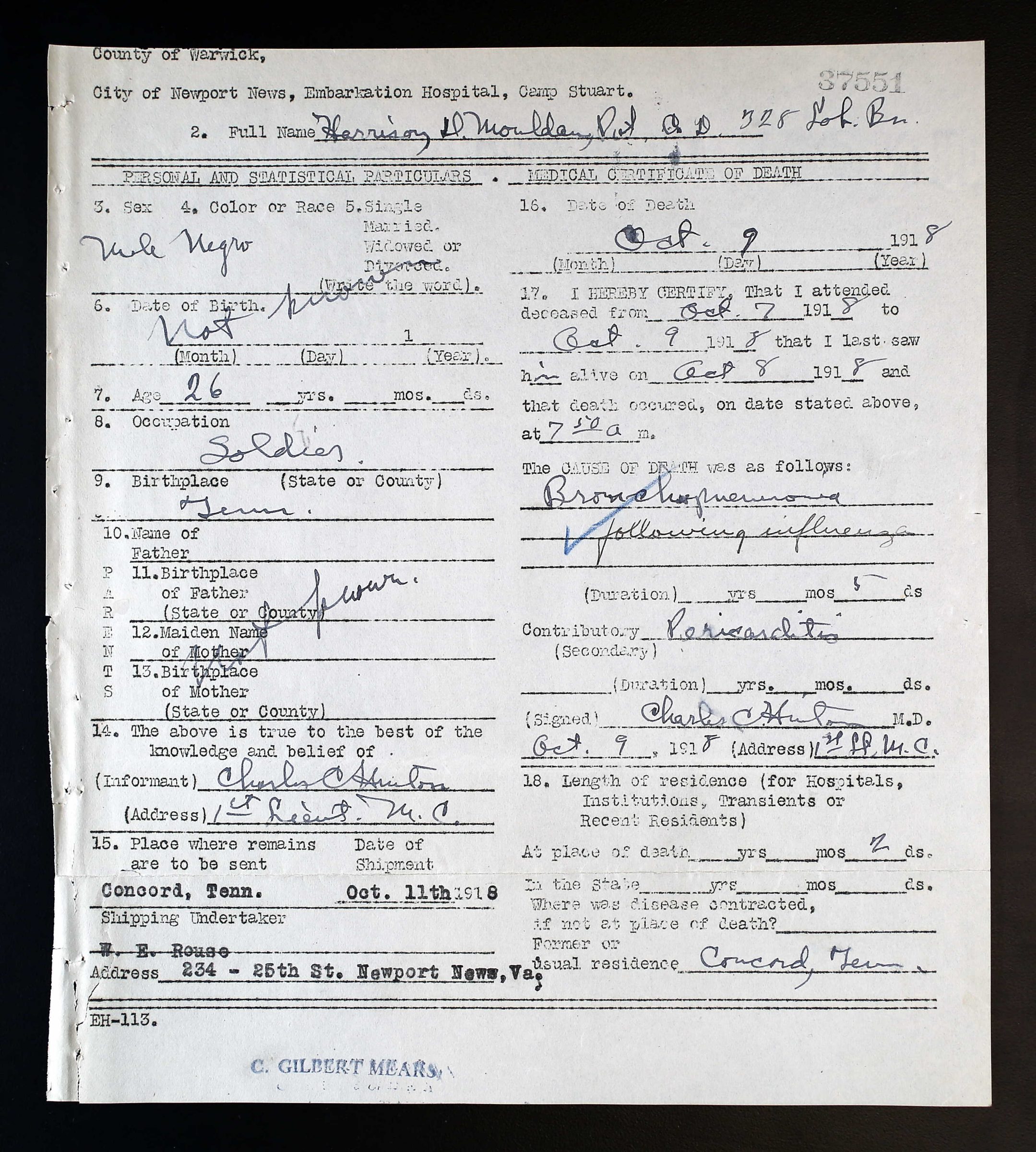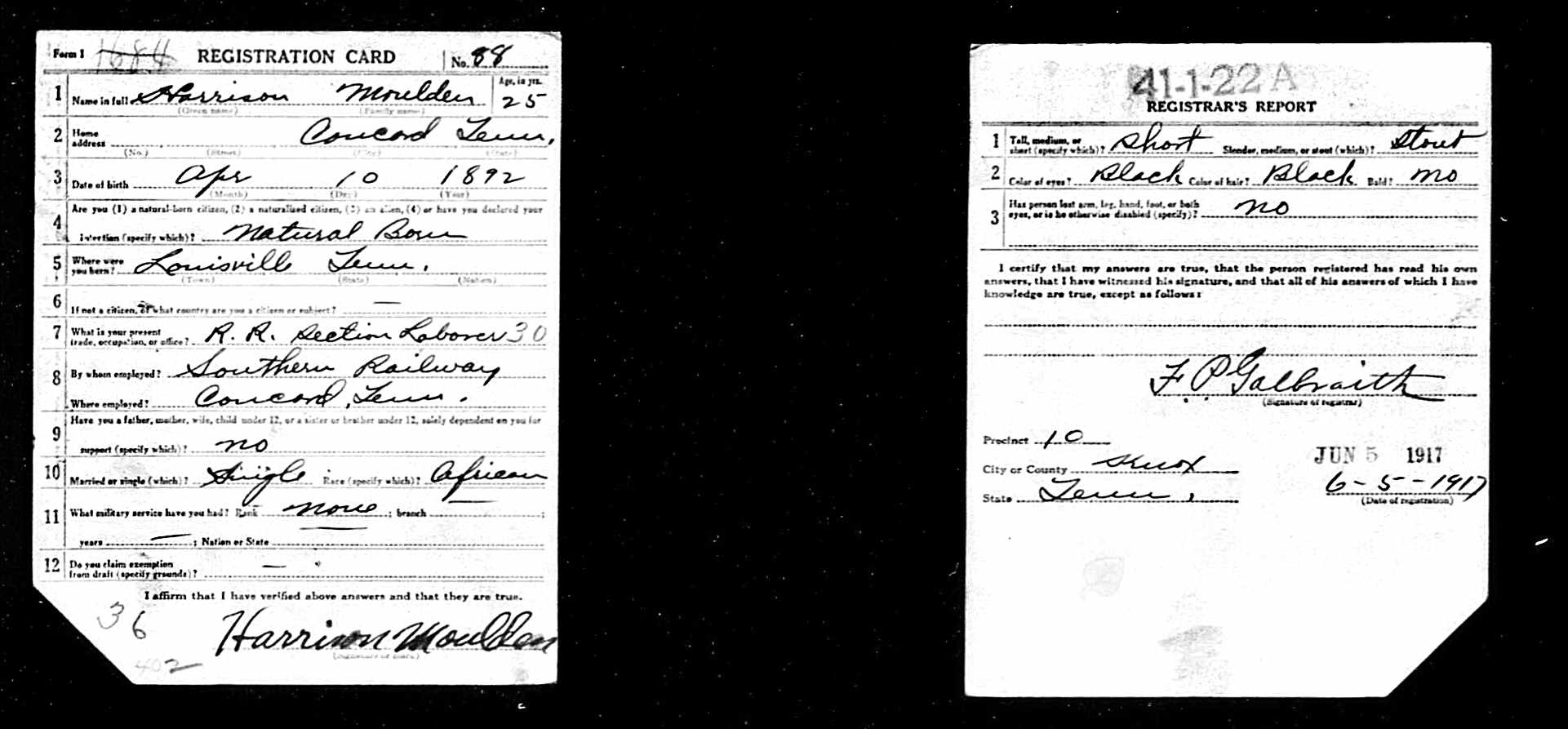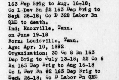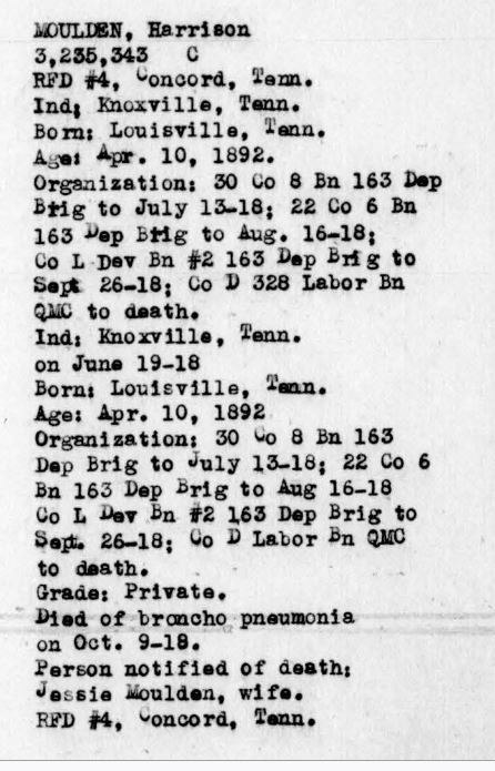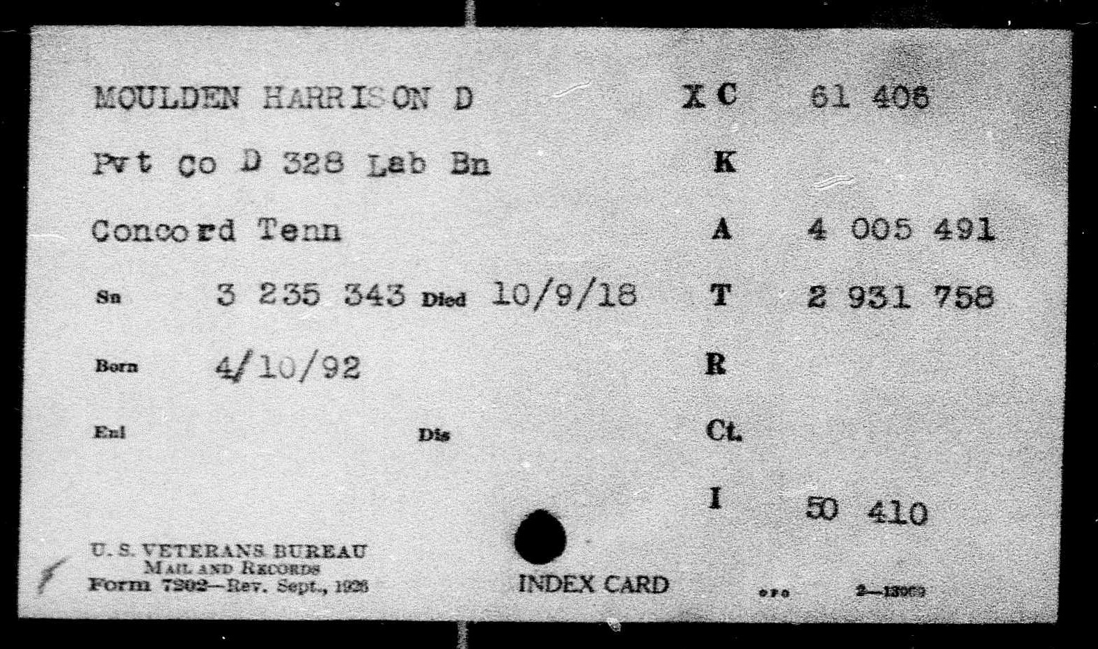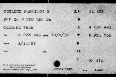 Private Harrison D. Moulden was born April 10, 1892 in Louisville, Tennessee. He was the son of Frank and Margaret Moulden and grew up in Monroe and Knox counties. He was married to Jessie Moulden. He was a resident of Concord in West Knoxville prior to enlisting in the United States Army on June 19, 1918. Harrison was a Railroad Section Laborer with the Southern Railway. Harrison died while in service of broncho pneumonia on October 9, 1918. He was returned home to his hometown of Concord and buried in the African-American section of Pleasant Forest Cemetery with members of his family.
