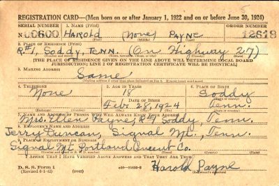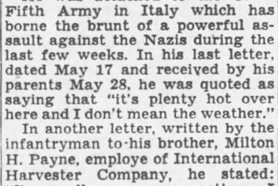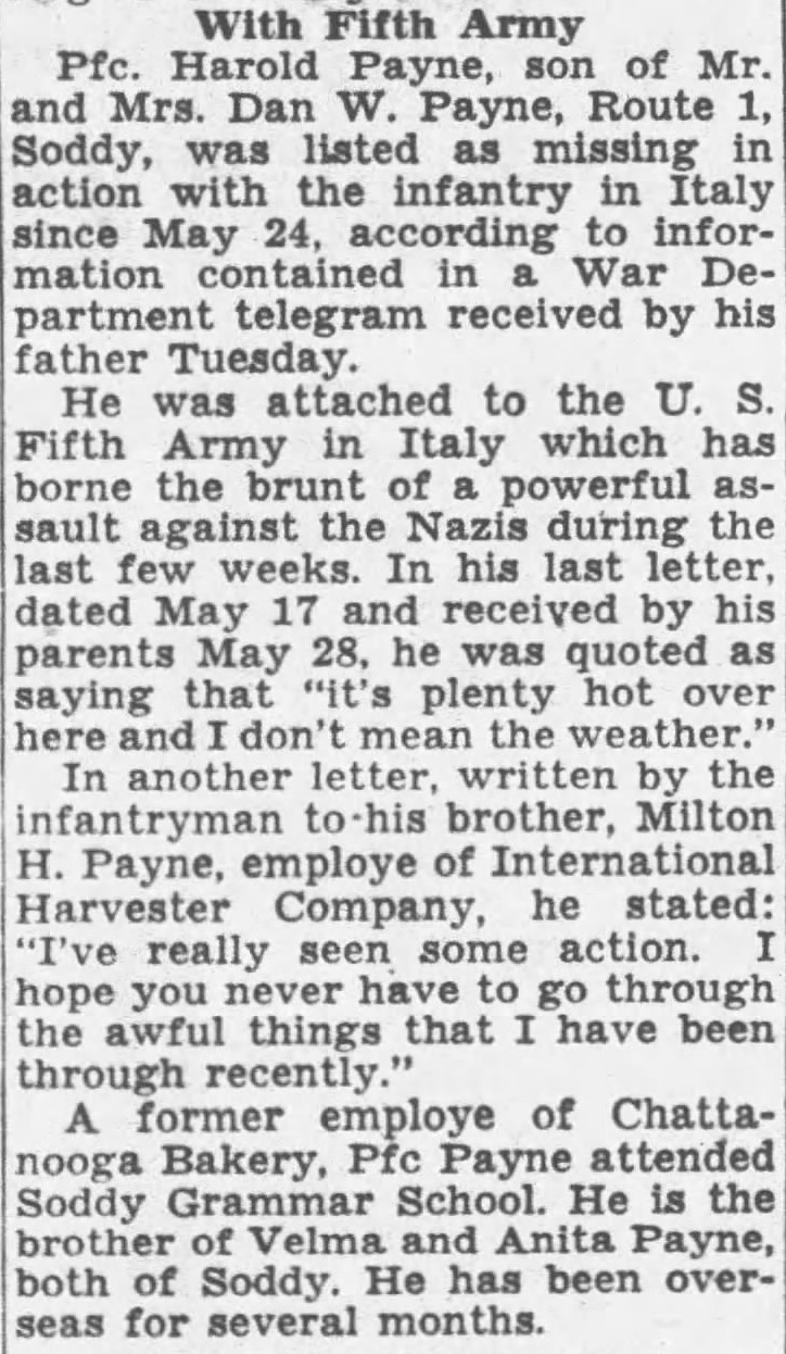 Pfc. Harold Payne, son of Mr. and Mrs. Dan W. Payne, Route 1, Soddy, was listed as missing in action with the infantry in Italy since May 24, according to information contained in a War Department telegram received by his father yesterday. He was attached to the U.S. Fifth Army in Italy which has borne the brunt of a powerful assault against the Nazis during the last few weeks. In his last letter, dated May 17 and received by his parents May 28, he was quoted as saying that “it’s plenty hot over here and I don’t mean the weather.” In another letter written by the infantryman to his brothers, Milton H. Payne, emplye of International Harvester Company, he stated: I’ve really seen some action. I hope you never have to go through the awful things that I have been through recently.”