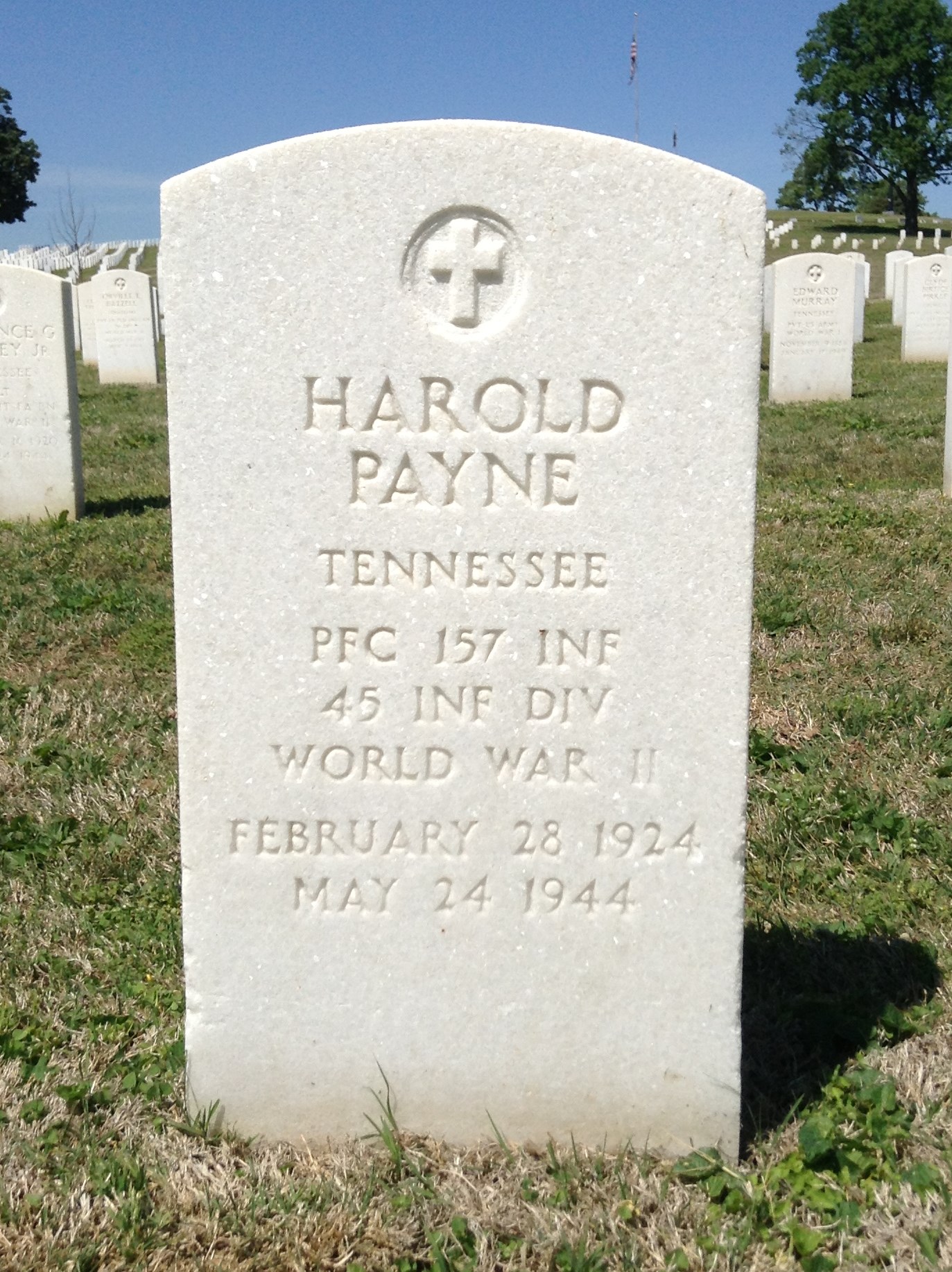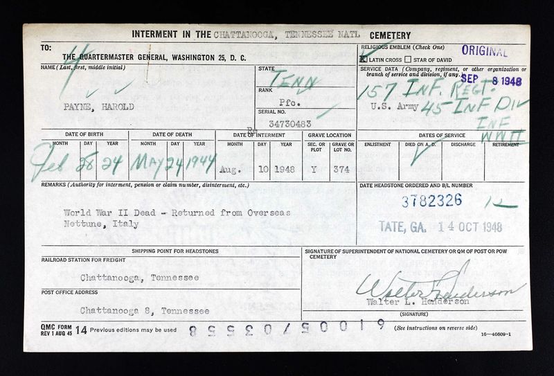 Killed in Action 24 May 1944 in Italy. PFC Payne was returned from Nettuno, Italy. Buried at Chattanooga National Cemetery, Y, 374.