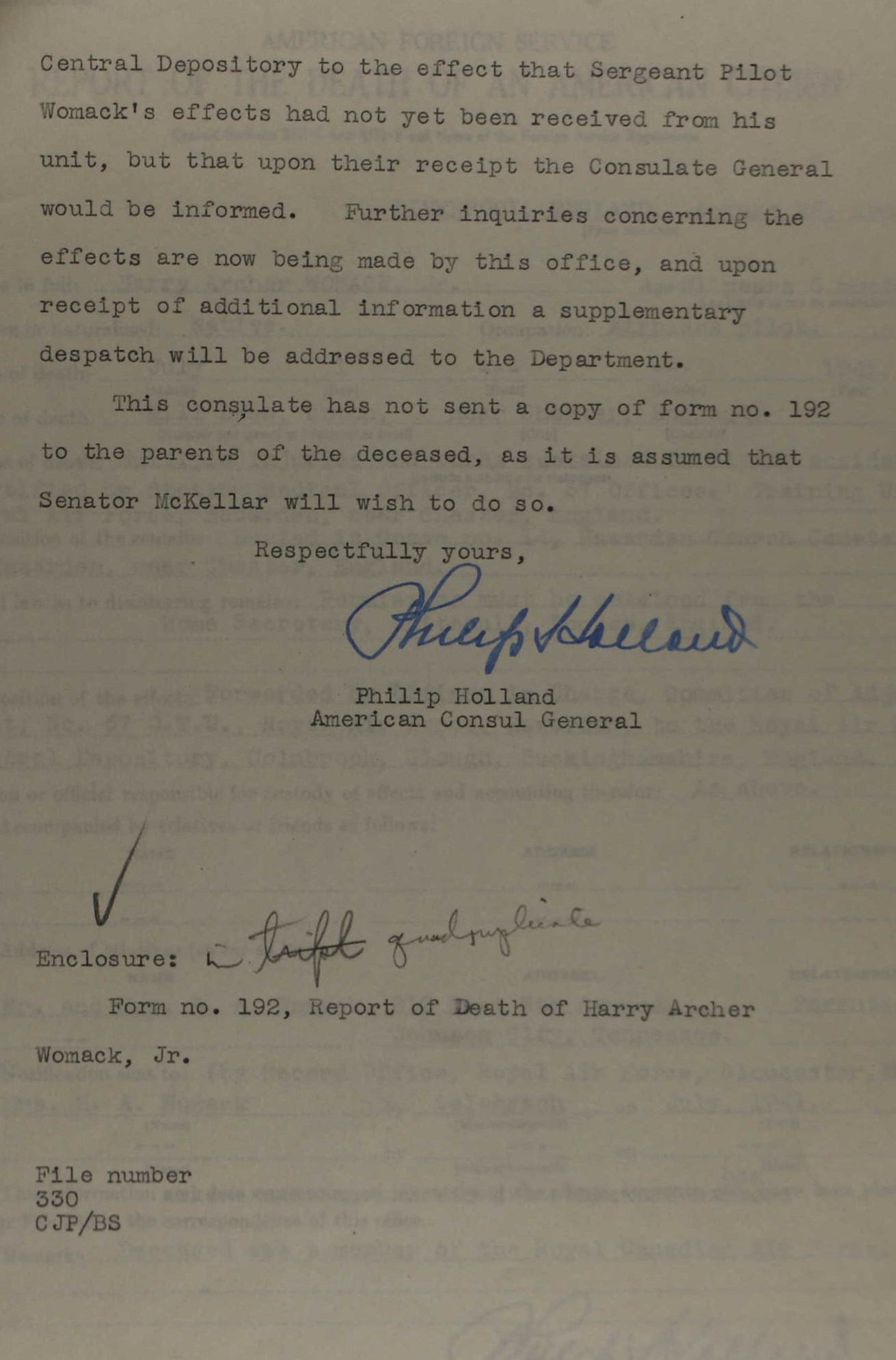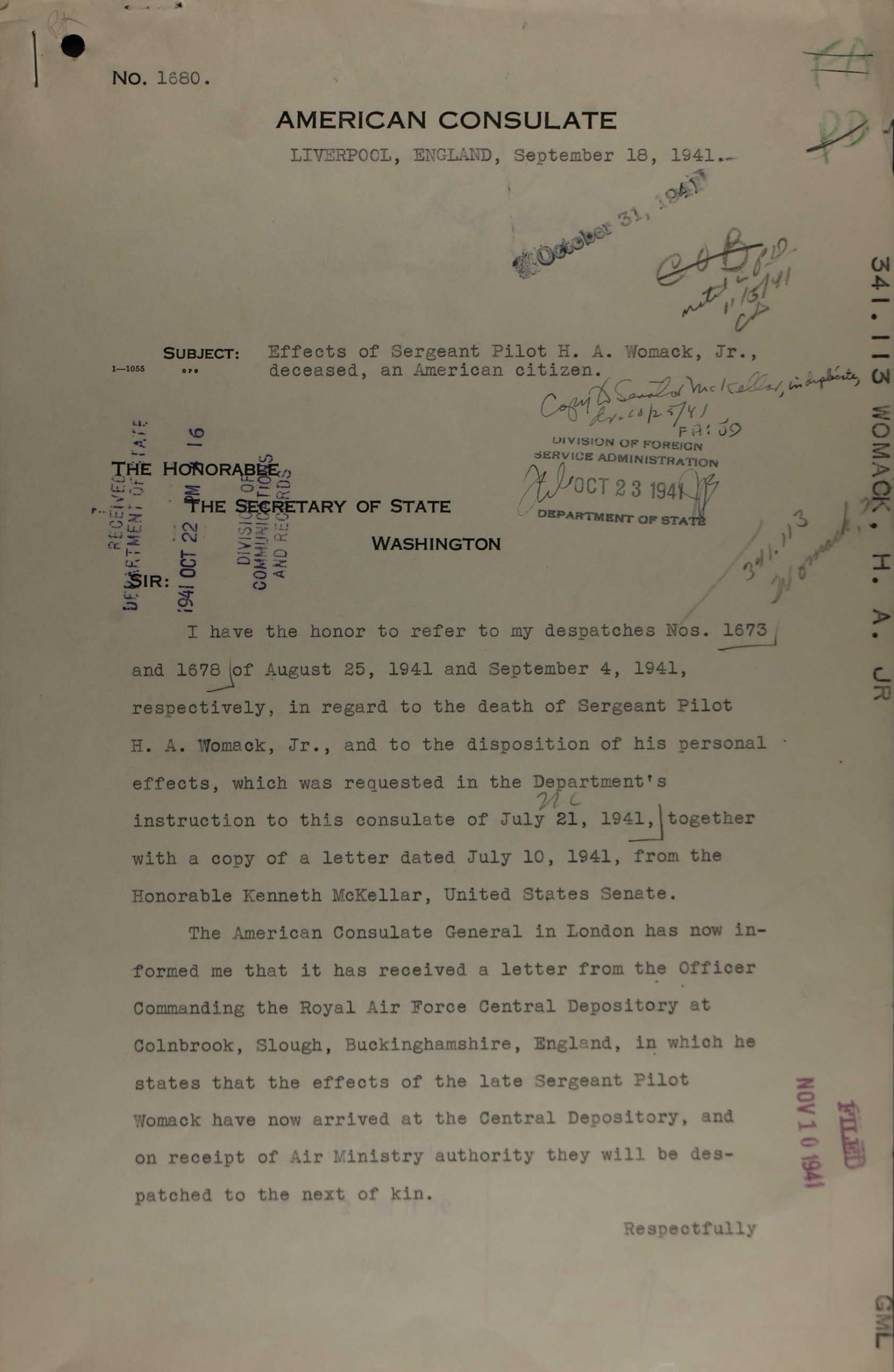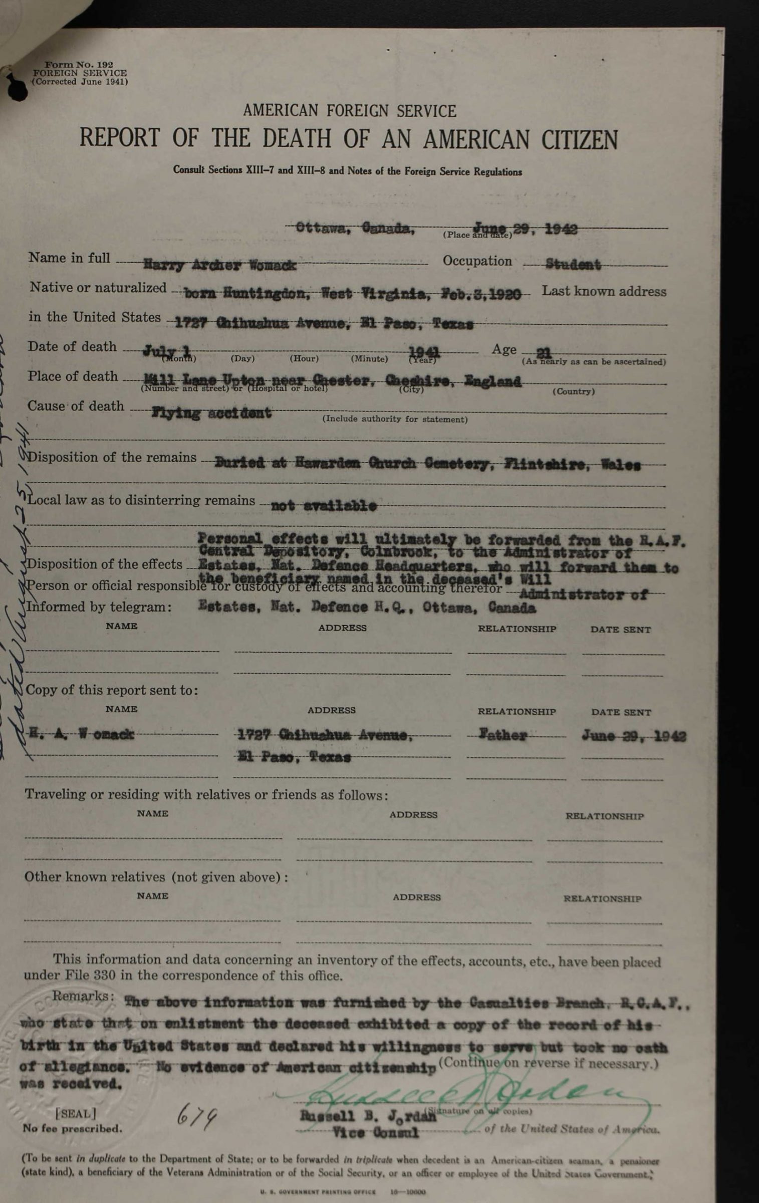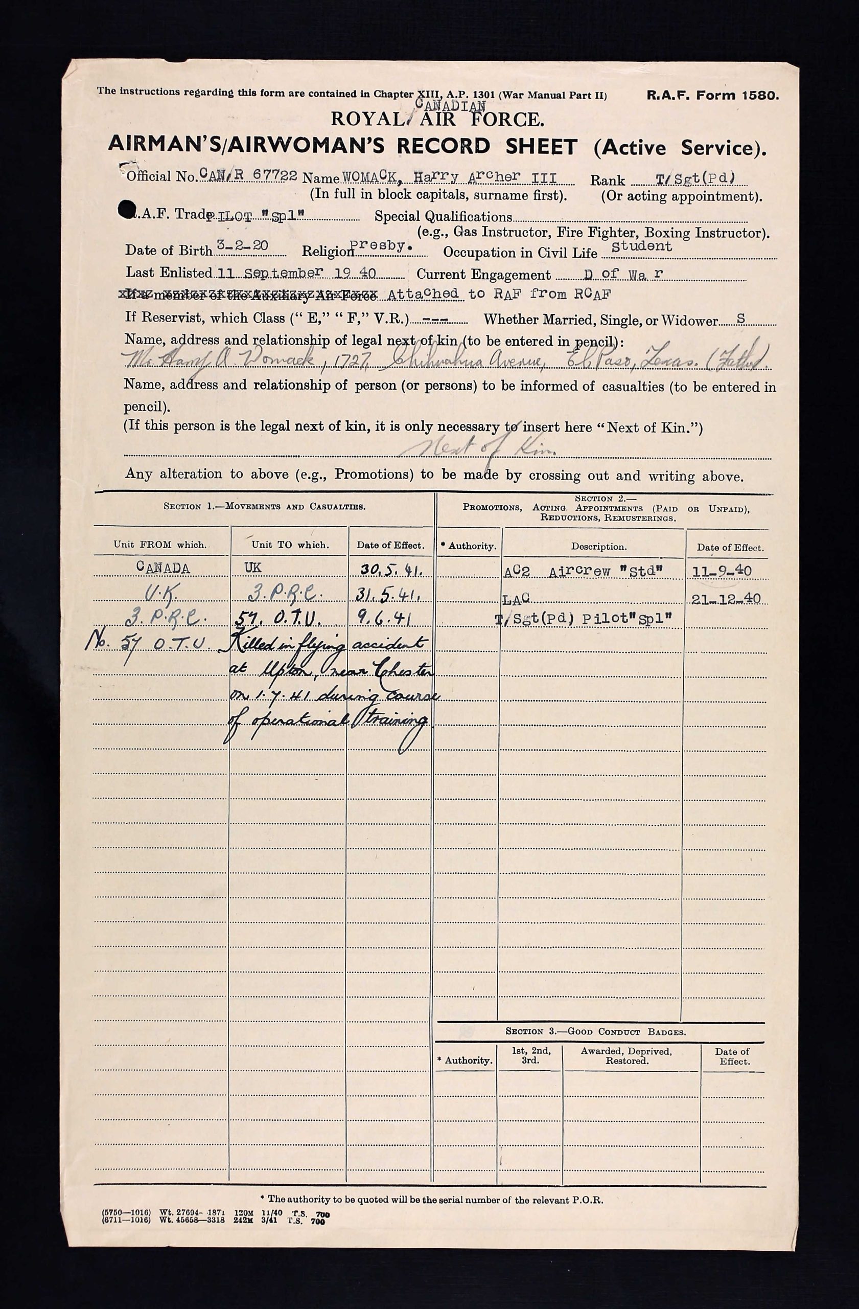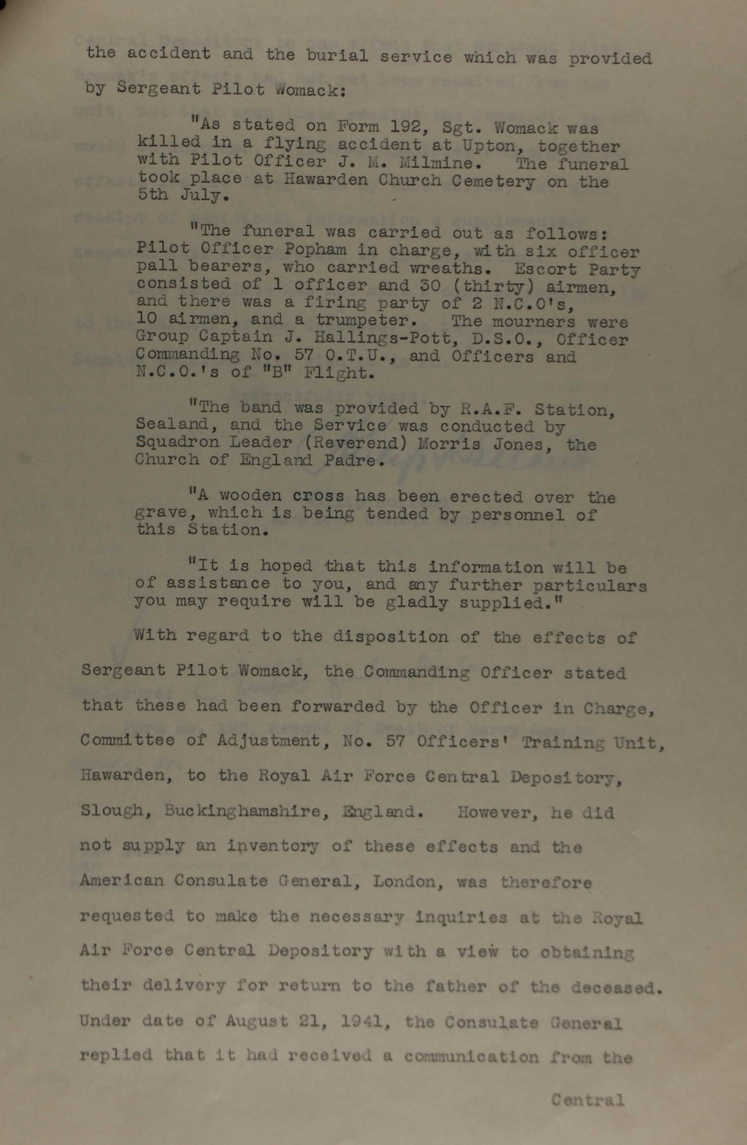 Details in the message were meager, but it was taken that Womack was not killed in action since the crash occured near the RAF station at Hawarden, near Chester….