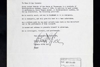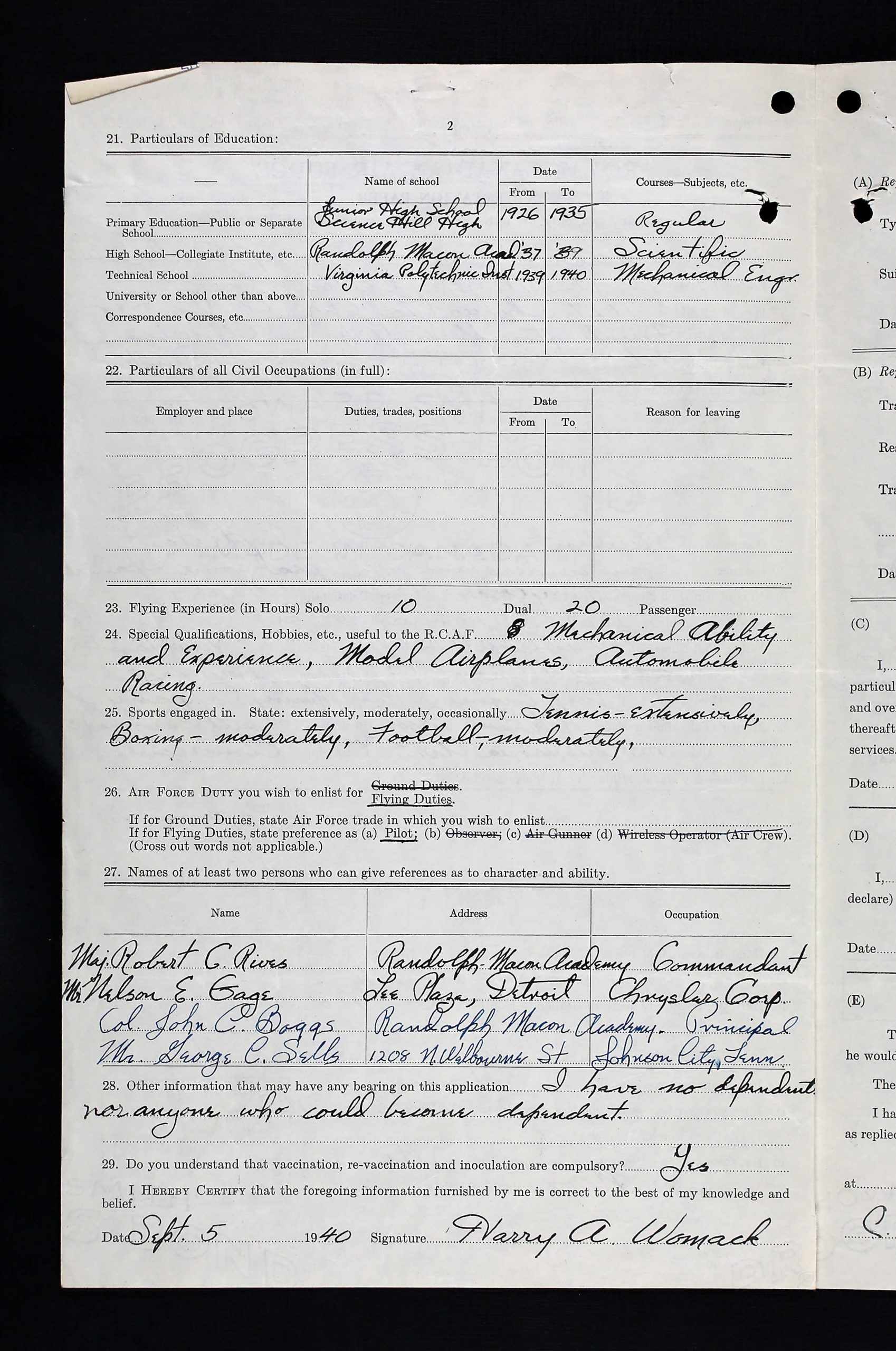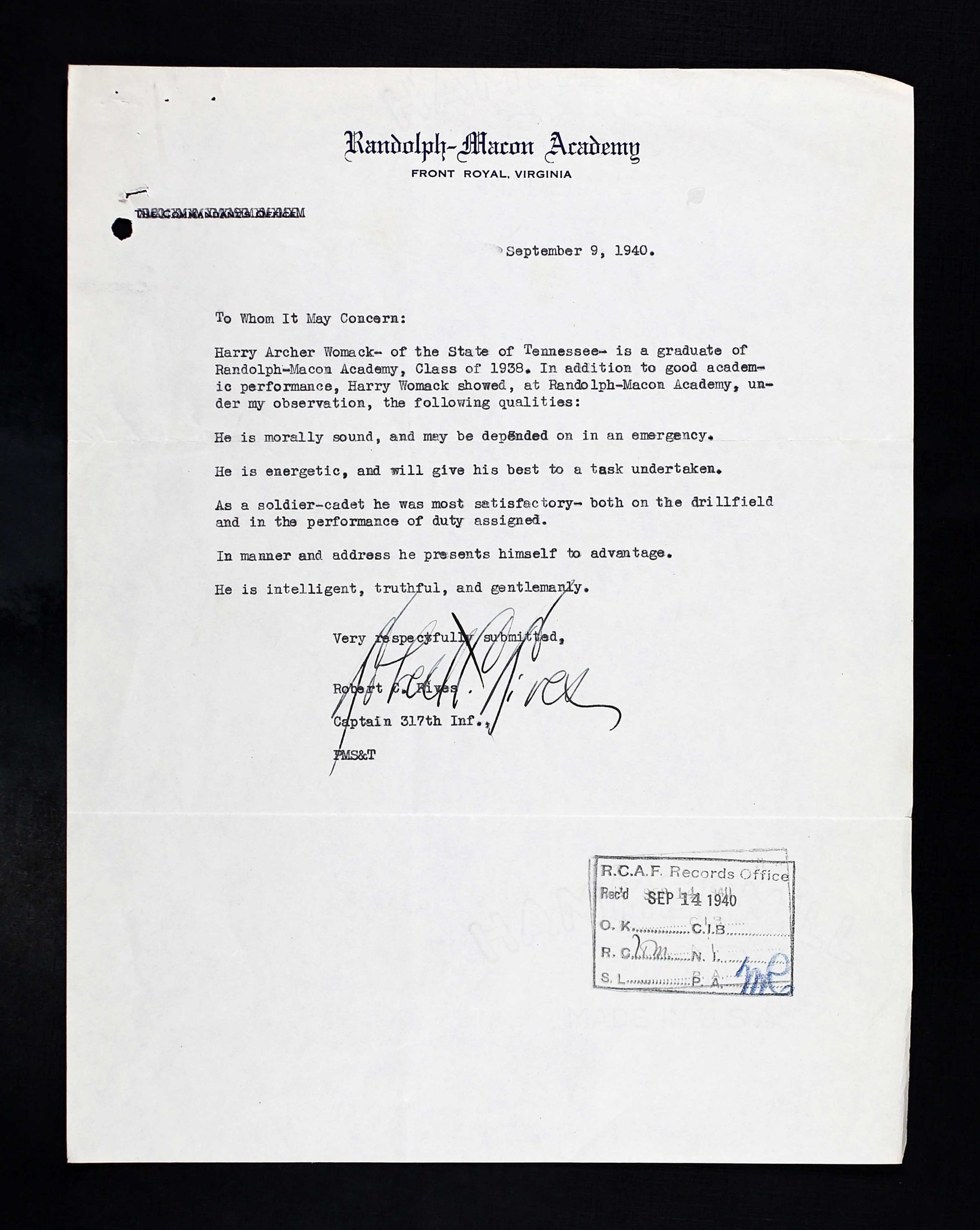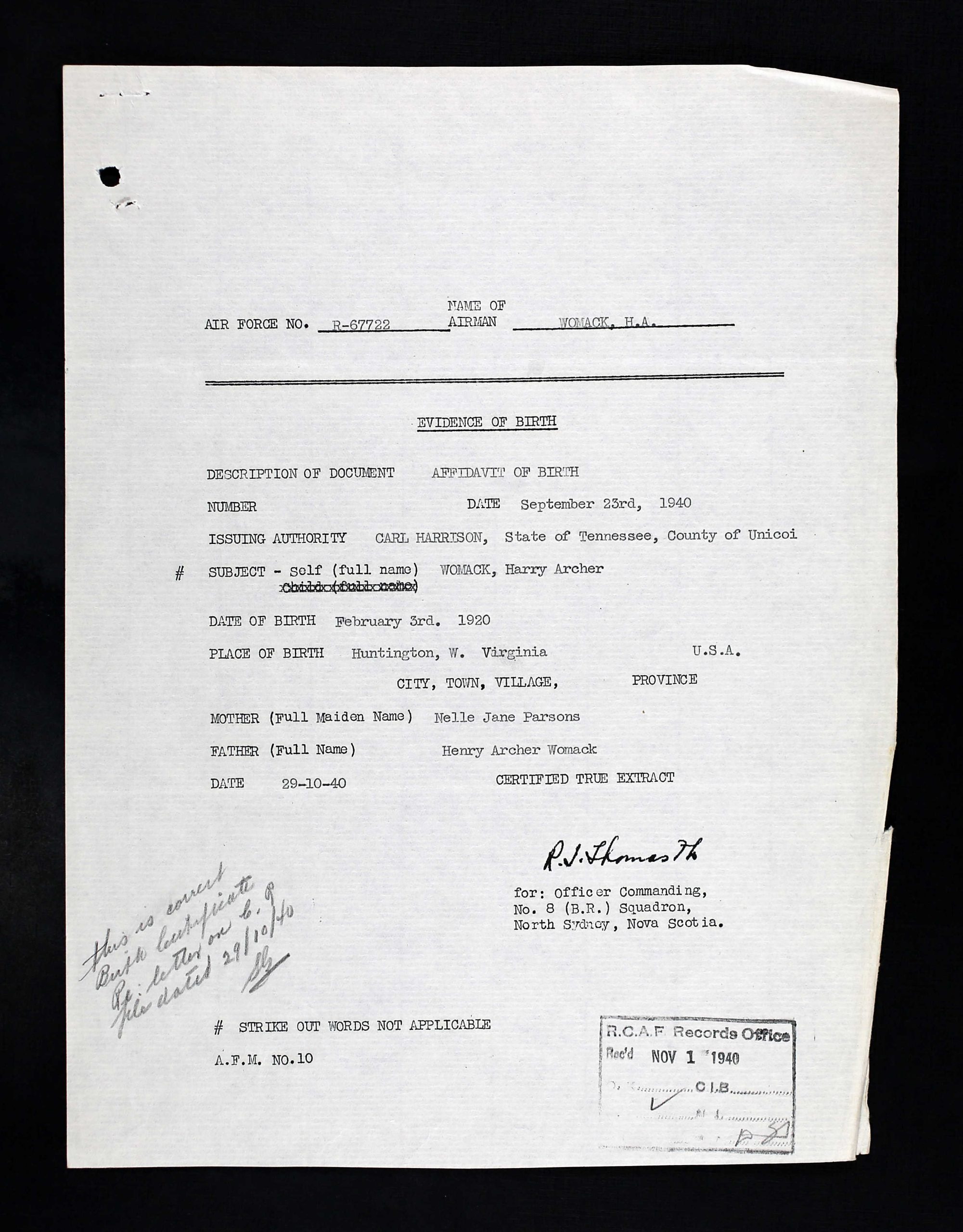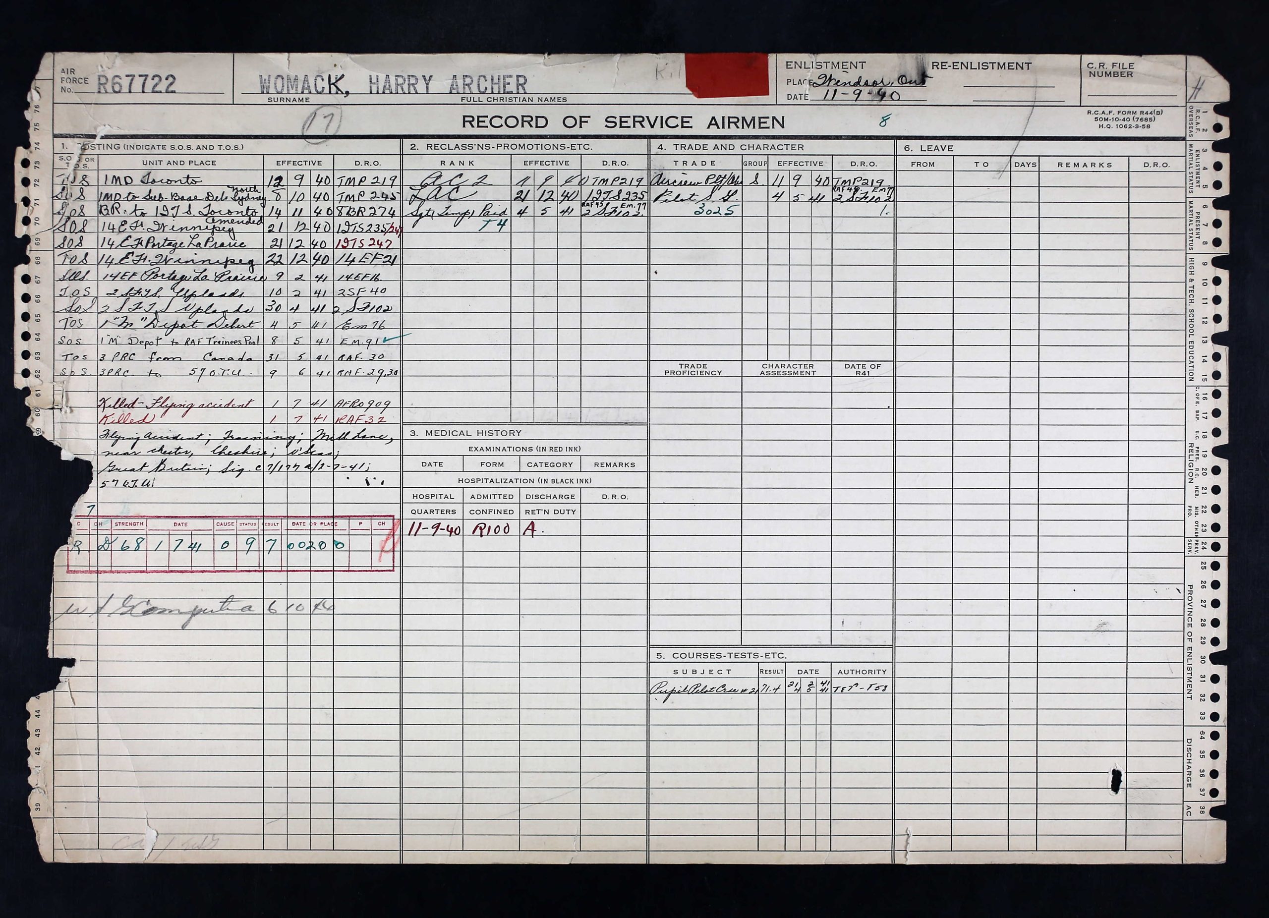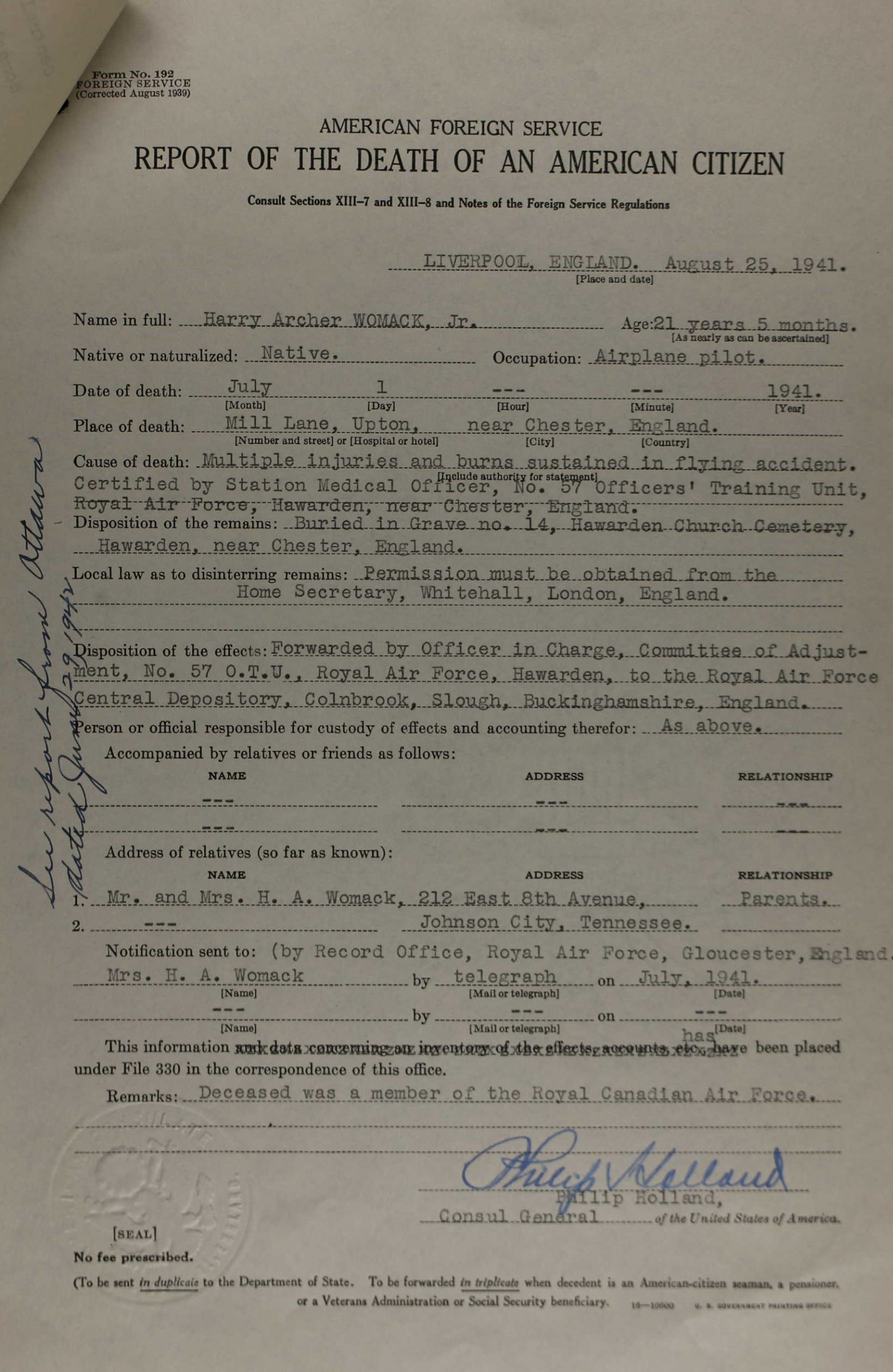 Possibly the first military casualty from East Tennessee in World War II, Sgt. Henry (Harry) Archer Womack Jr., a member of the Royal Canadian Air Force, was killed in a flying accident at Upton, Cheshire, England while on an operational flight. He is buried in the Hawarden churchyard, Flintshire, Wales.
