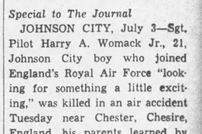 JOHNSON CITY, July 3 – Sgt Pilot Harry Womac Jr., 21, Johnson City boy who joined England’s Royal Air Force looking for something a little exciting, was killed in an air accident Tuesday near Chester, Cheshire, England, his parents learned by cablegram today.
