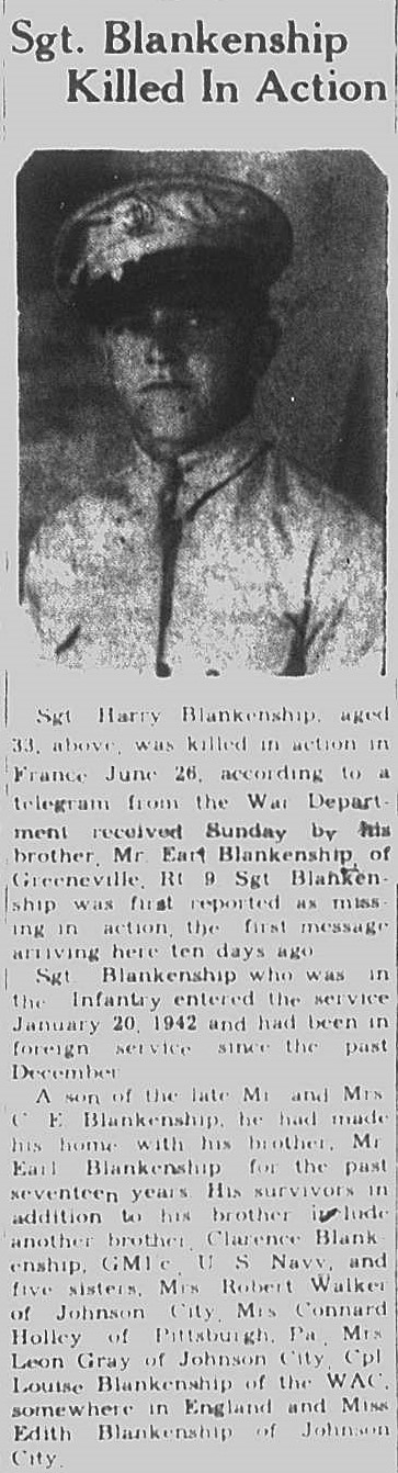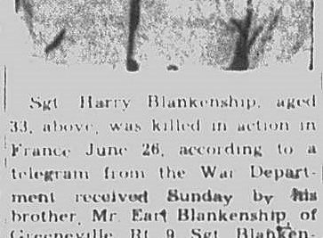 Sgt. Harry Blankenship, aged 33, was killed in action in France, June 26, according to a telegram from the War Department received Sunday by his brother, Mr. Earl Blankenship of Grenneville, Rt. 9. Sgt. Blankenship was first reported as missing in action, the first message arriving here ten days ago.