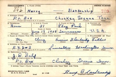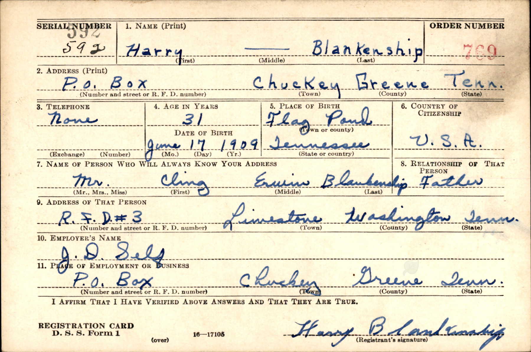 Harry Blankenship was born at Flag Pond, Tennessee, the son of Clingman Erwin Blankenship and Minnie Belle Hensley.