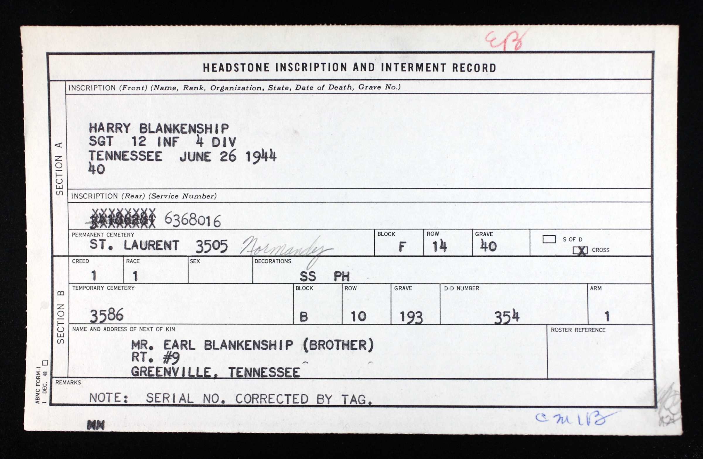 Sergeant Harry Blankenship was assigned to the 12th Infantry Regiment, 4th Infantry Division during the Normandy Campaign. He died 26 June 1944 and is interred at F,14,44, Normandy American Cemetery, Colleville-sur-Mer, France.