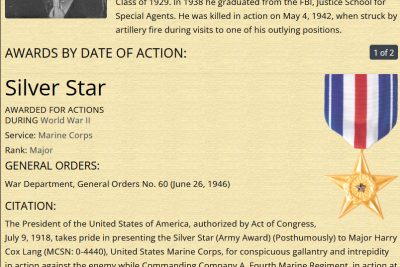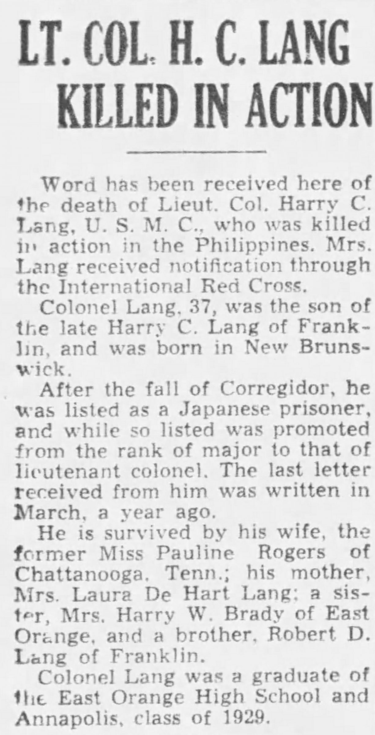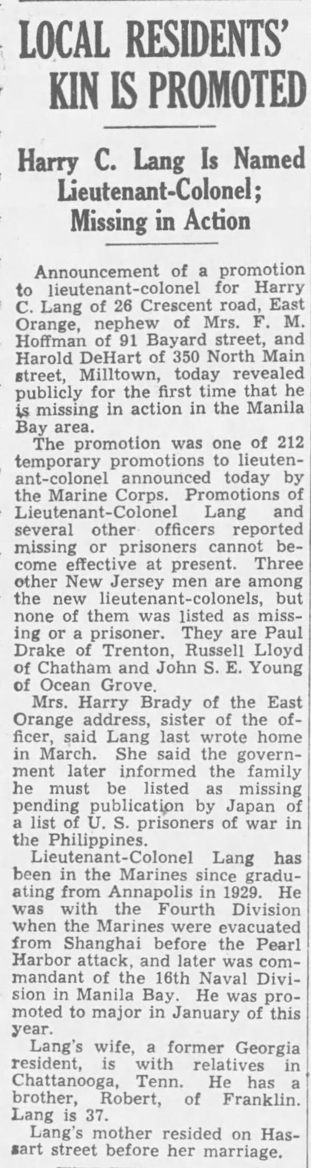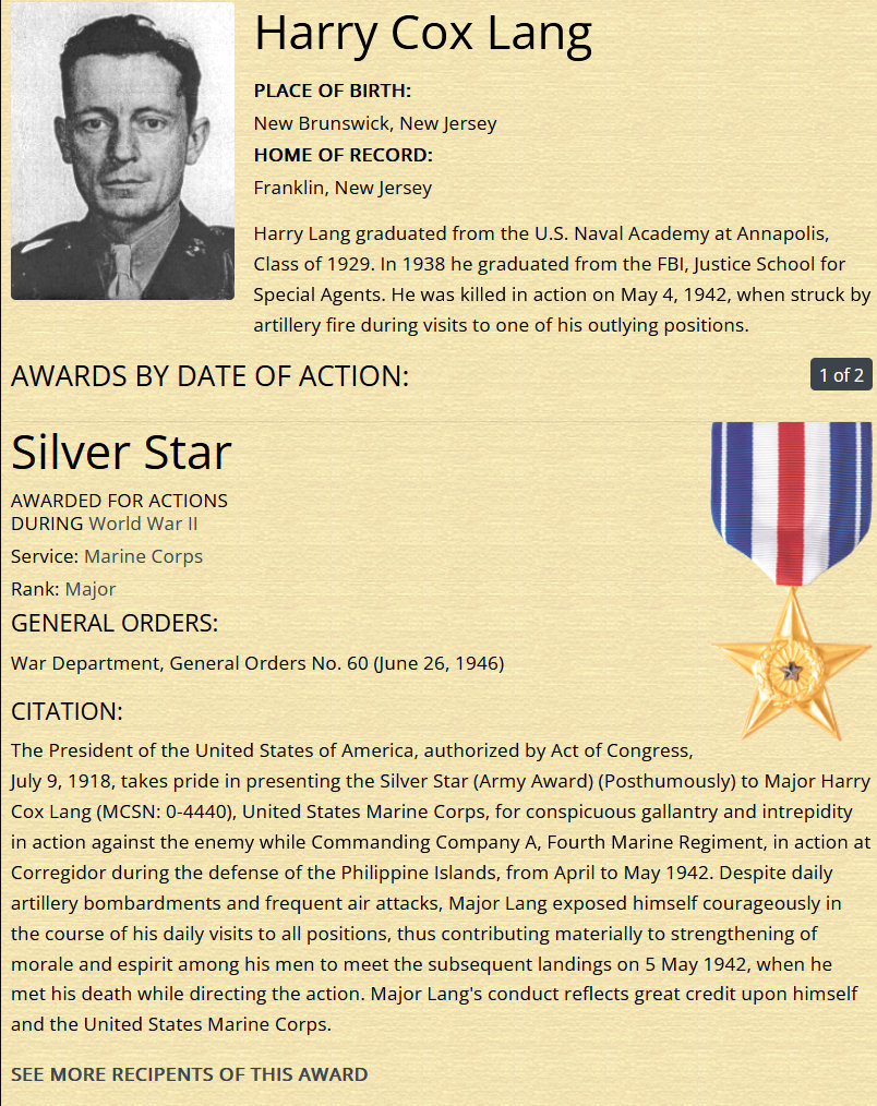 Harry Cox Lang was deployed to the Pacific theater, he was stationed on Corregidor and was with the 4th Marines, during their spirited defence, against the Japanese, near Kindley field. He was sadly lost there, when Corregidor fell on May 6, 1942.