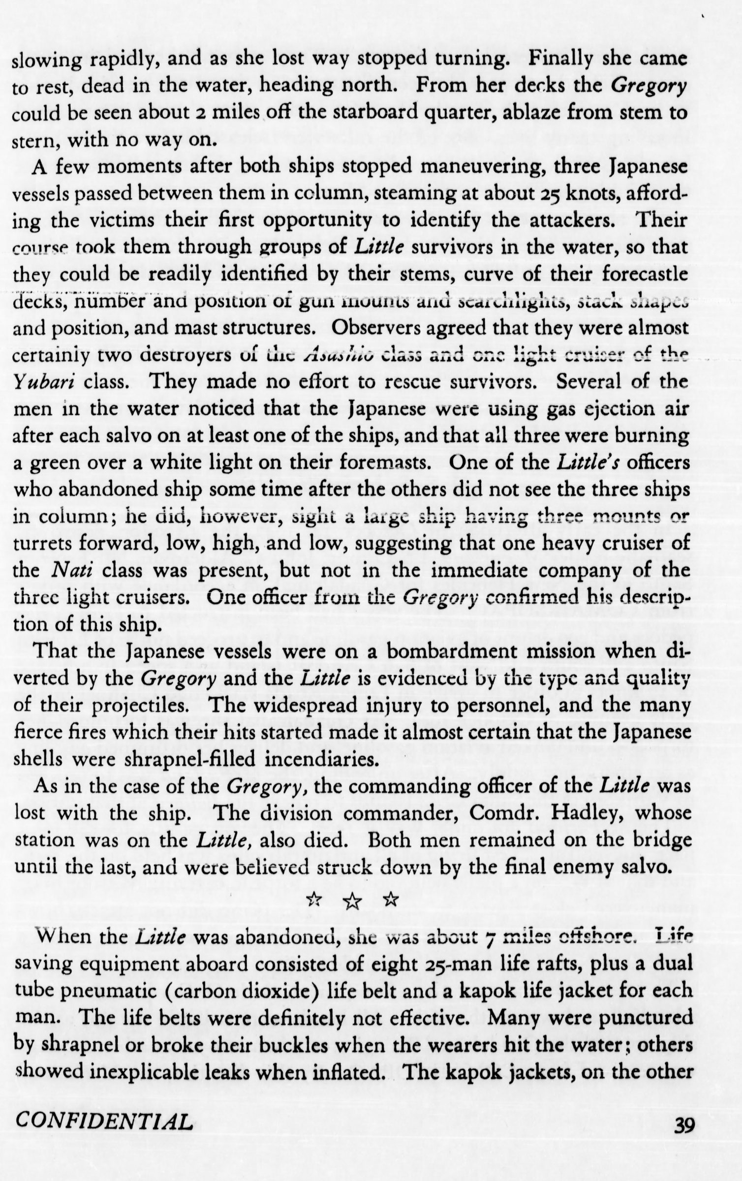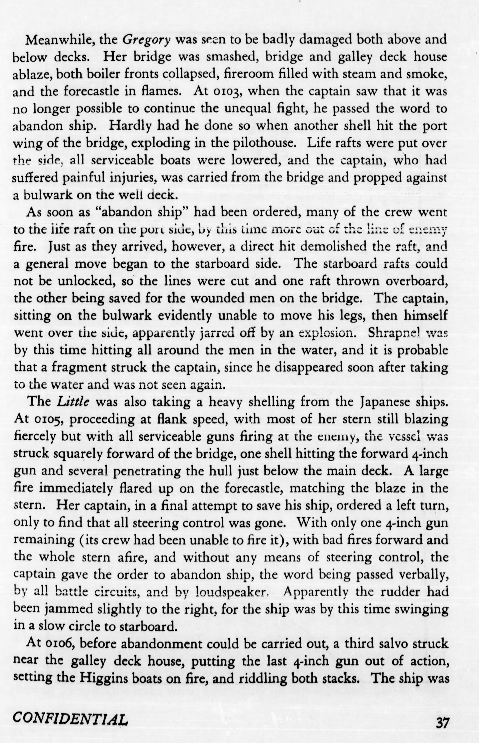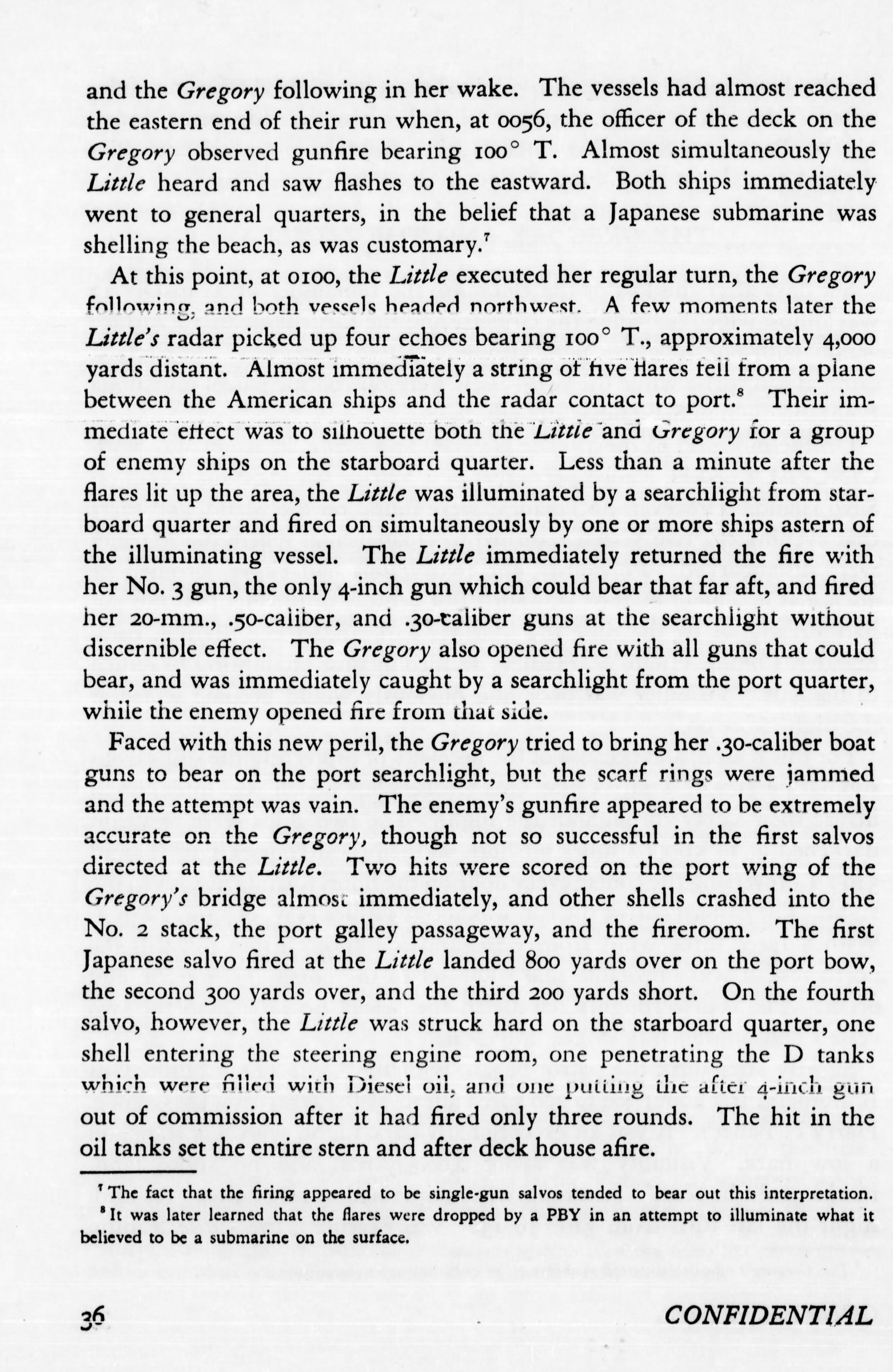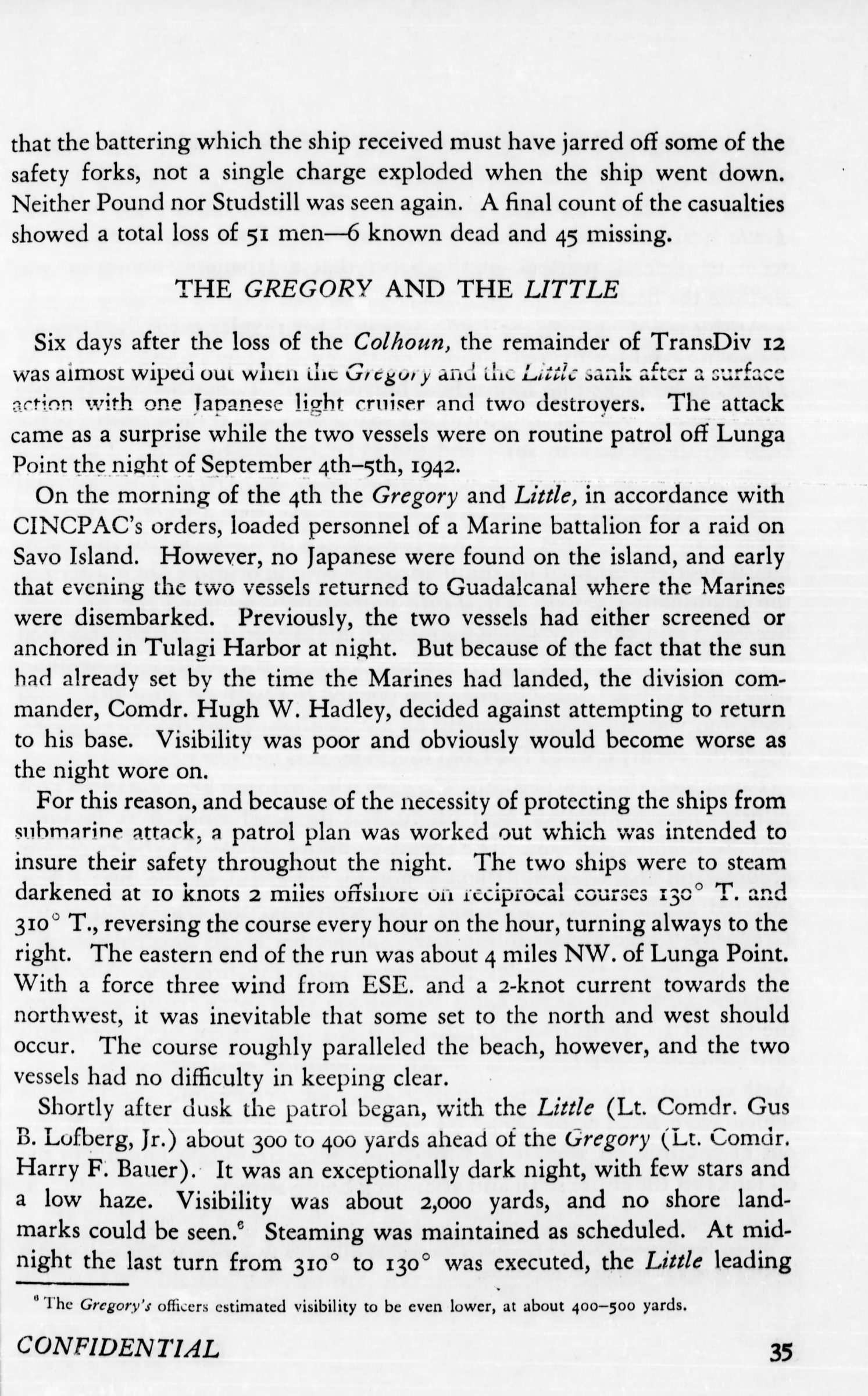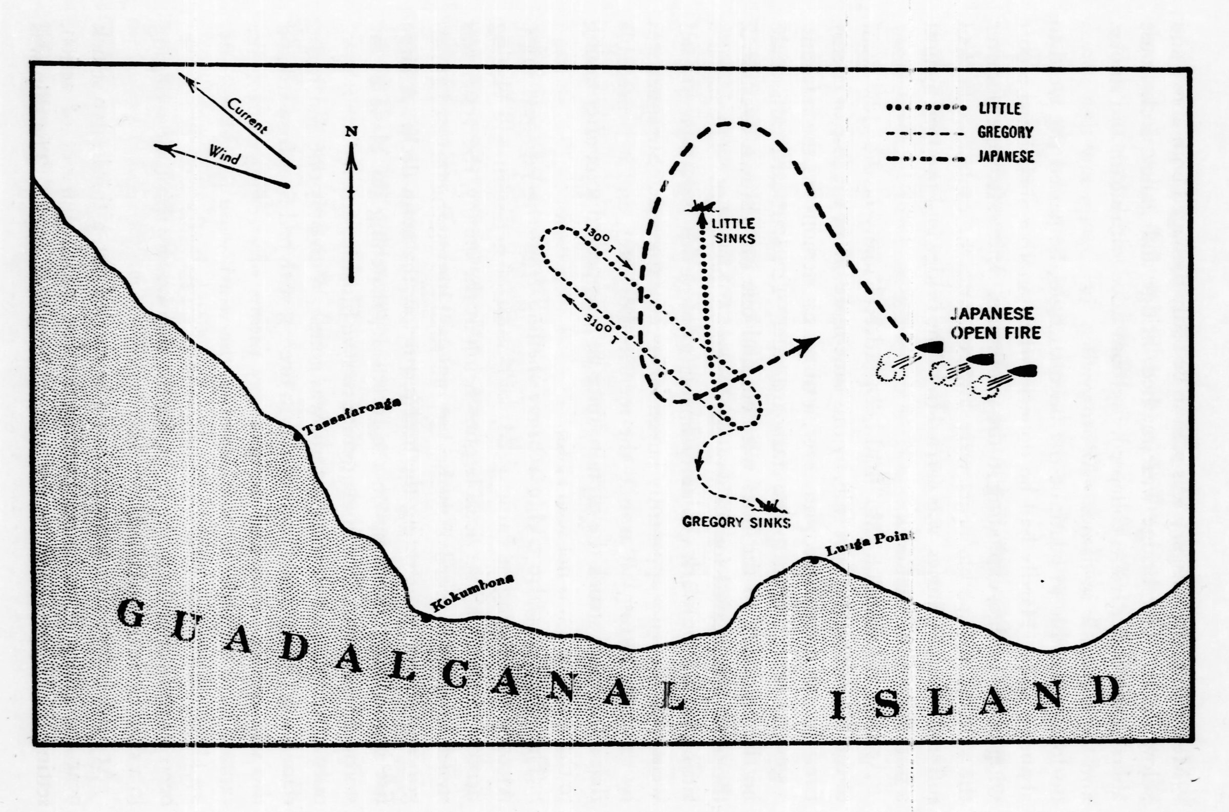 On the night of 4-5 September 1942 the Gregory along with the USS Tracy was slowly transiting the area off Guadalcanal due to pitch black darkness when they noted gun fire nearby; while deciding how to proceed the two ships’ positions were given away when an American plane dropped flares over them and revealed them to three Japanese destroyers, Yudachi, Hatsuyuki, and Murakumo. In a running battle the two outgunned transports fought valiantly before being sunk.