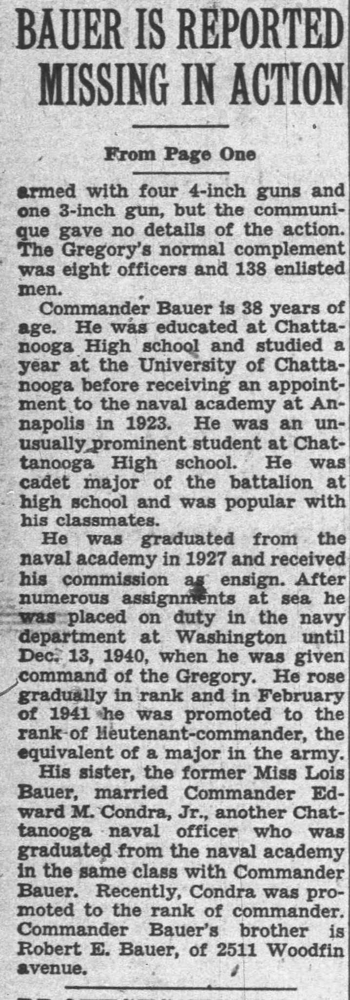 Lt Comdr Bauer was badly wounded, giving the order to abandon ship and while being pulled clear of the ship by two of his crew he ordered them to rescue another man who was crying for assistance. Lt Comdr Bauer was lost. A finding of death was given on 4 September 1942. For his actions he was posthumously given the Silver Star.