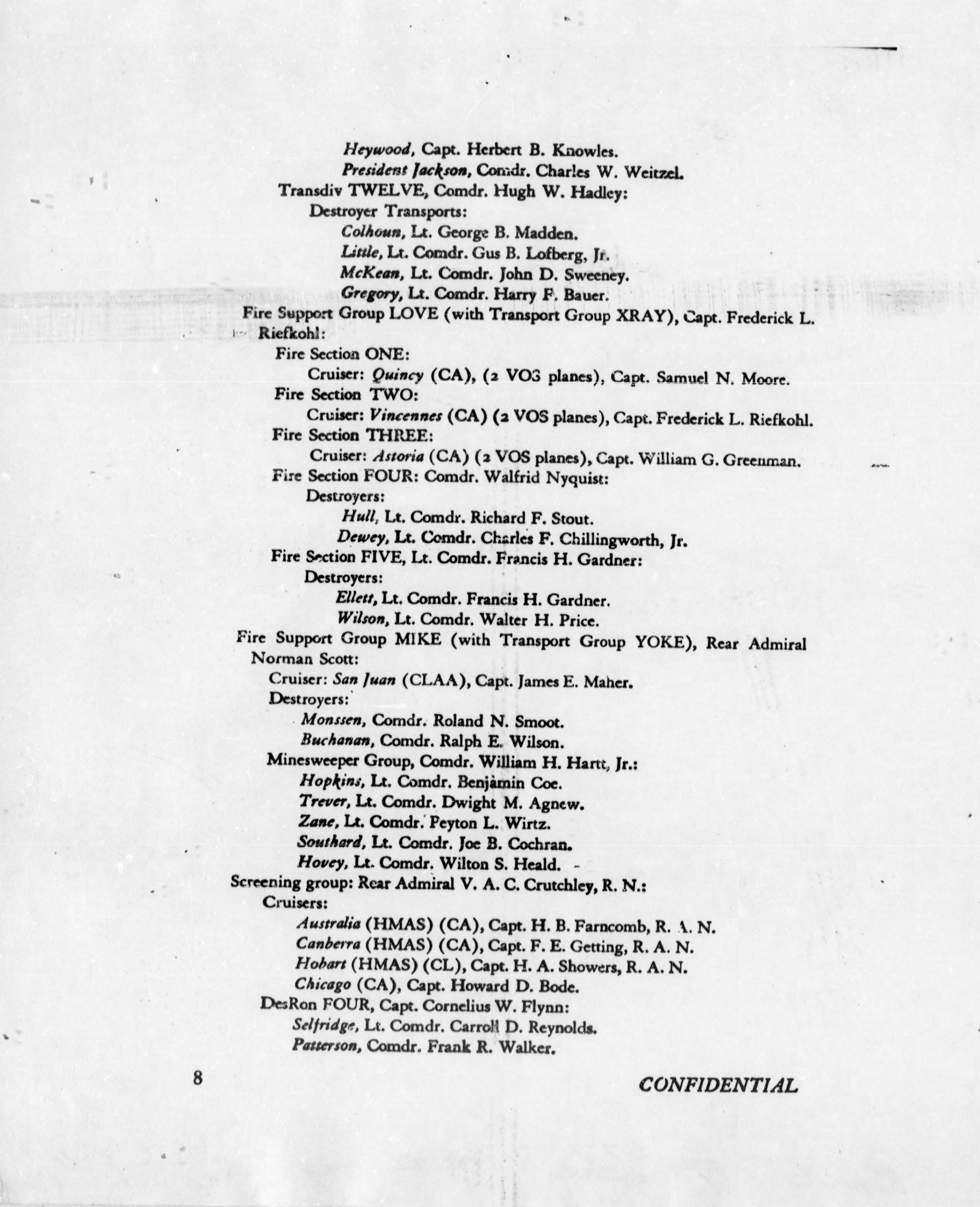 Lieutenant Commander Harry F. Bauer was born 17 July 1904 at Camp Thomas Lytle, Georgia. He was a graduate of the Naval Academy Class of 1927. During the early part of his career he served at shore stations, including a tour as instructor at the Naval Academy, and on USS Twiggs, USS Cuyama, and USS Tracy. Bauer was commisioned Lieutenant Commander 1 July 1941 and took command of the Fast Transport USS Gregory APD-3 on 1 January 1942. The Gregory landed Marines at Guadalcanal on 7 August 1942. The Gregory remained in the area following the landing giving support to the troops on shore and ferrying supplies.