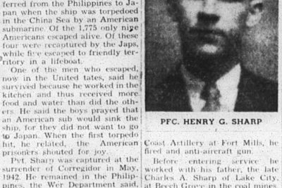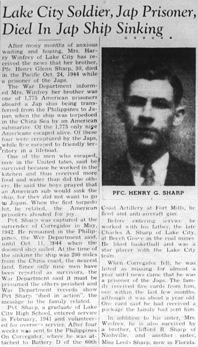 After many months of anxious waiting and hoping, Mrs. Harry Winfrey of Lake City has received the news that her brother, Pfc. Henry Glenn Sharp, 30, died in the Pacific, Oct. 24, 1944 while a prisoner of the Japs. The War Department informed Mrs. Winfrey her brother was one of 1775 American prisoners aboard a Jap ship being transferred from the Philippines to Japan when the ship was torpedoed in the China Sea by an American submarine. Of the 1775 only nine Americans escaped alive. Of these four were recaptured by the Japs, while five escaped to friendly territory in a lifeboat. One of the men who escaped, now in the United States, said he survived because he worked in the kitchen and thus received more food and water than did the others. He said the boys prayed that an American sub would sink the ship, for they did not want to go to Japan. When the first torpedo hit, he related, the Amrican prisoners shouted for joy. Pvt. Sharp was captured at the surrender of Corregidor in May, 1942. He remained in the Philippines, the War Department said, until Oc. 11, 1944 when teh doomed ship sailed. At the time of the sinking the ship was 200 miles from the China coast, the nearest land. Since only nine men have been reported as survivors, the War Department said it must be presumed the others perished and War Department records sho Pvt. Sharp died in action, the message to the family related. Pvt. Sharp, a graduate of Lake City High School, entered service in February, 1941 and volunteered for overseas service. After four weeks was sent to the Philippines on Corregidor, where he was attached to Battery D of the 60th Coast Artillery at Fort Mills, he fired an anti-aircraft gun. Before entering service he worked with his father, the late Charles A. Sharp of Lake City, at Beech Grove in the coal mines. He liked basketball and was a star player with the Lake City team. When Corregidor fell, he was listed as missing for almost a year until news came that he was a prisoner of the Japs. The family received five cards from him, one within the last few months, although it was about a year old. One card said he had received a package the family had sent him. In addition to his sister, Mrs. Winfrey, he is also survived by a brother, Clifford R. Sharp of Nashville and another sister, Miss Leola Sharp, now in Florida.