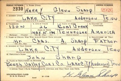 Harry Glenn Sharp was born in Coal Creek, Tennessee to Charles A. Sharp.