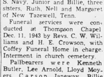 He had an accident at Kannapolis, Cabarrus, North Carolina on 1 December 1943 and was admitted at the Cabarrus Hospital at Kannapolis that same day but died 5 days later of his injuries. He is buried at Thompson Chapel Cemetery, Claiborne County, Tennessee.
