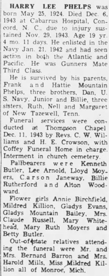 Harry Lee Phelps was born May 25, 1924. Died Dec. 6, 1943 at Cabarrus Hospital, Concord, N.C., due to injury sustained Nov. 29, 1943. Age 19 yr. 4 mo. 11 days. He enlisted in the Navy Jan. 21. 1942 and had seen action in both the Atlantic and Pacific. He was Gunners Mate Third Class. He is survived by his parents, Frank and Hattie Mountain Phelps, three brothers, Dan, U.S. Navy, Junior and Billie, three sisters, Ruth, Nell and Margaret of New Tazewell Tenn.