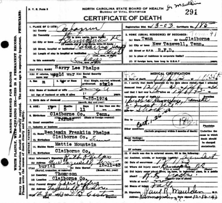 Harry Lee Phelps was born on 25 May 1924 in Claiborne County, Tennessee and was the son of Benjamin Franklin Phelps and Mattie Mountain.