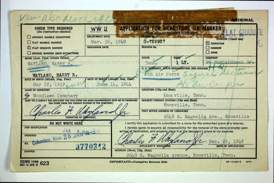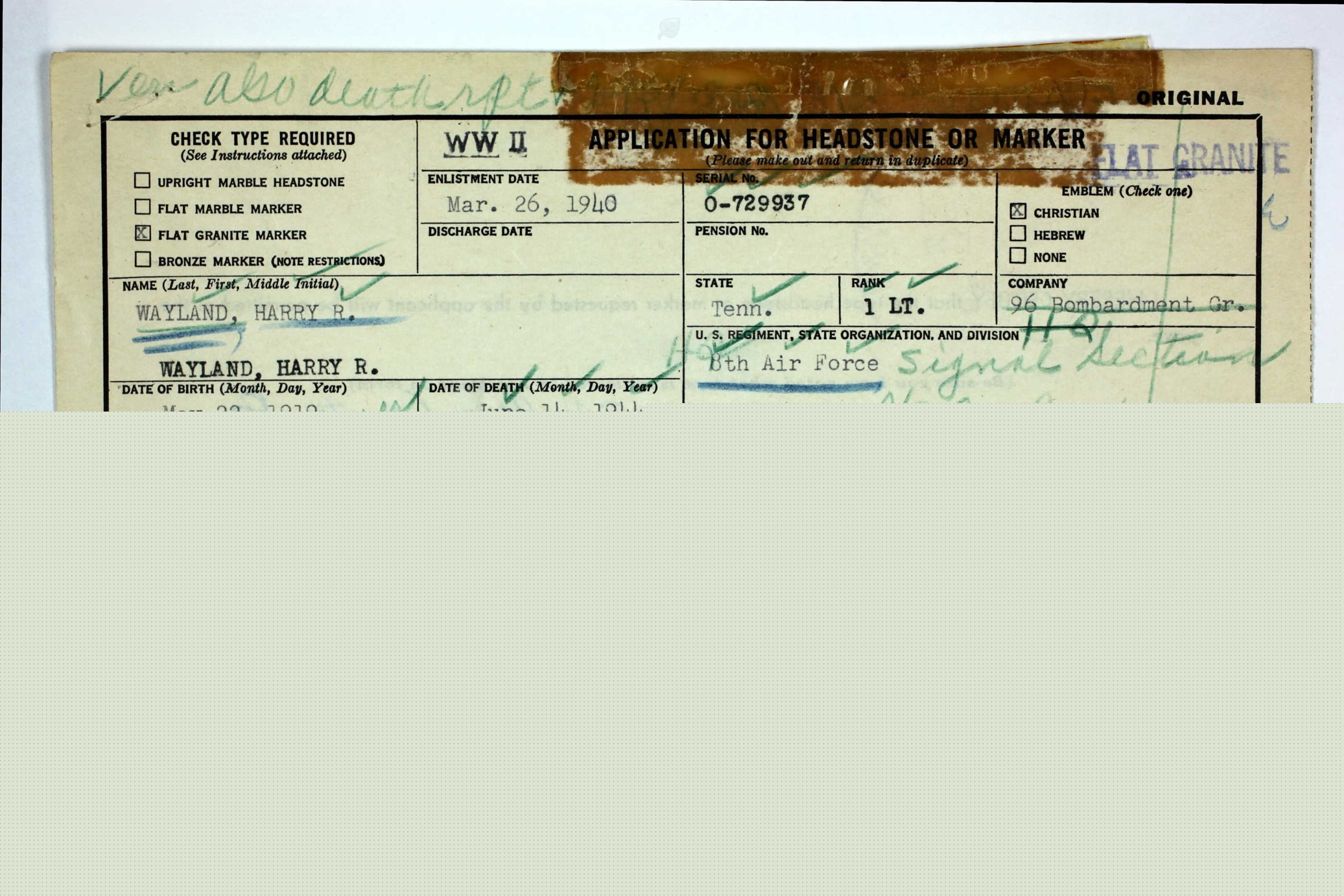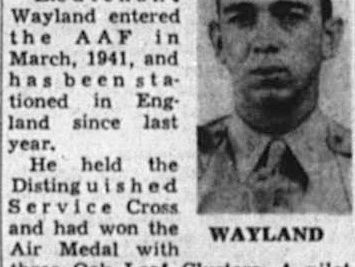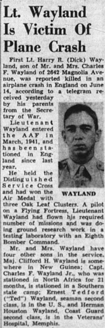 First Lt. Harry R. (Dick) Wayland, son of Mr. and Mrs. Charles F. Wayland of 2642 Magnolia Avenue, was reported killed in an airplane crash in England on June 14, according to a telegram received yesterday by his parents from the Secretary of War. Lieutenant Wayland entered the AAF in March, 1941, and has been stationed in England since last year. He held the Distinguished Service Cross and had won the Air Medal with three Oak Leaf Clusters. A pilot of a Flying Fortress, Lieutenant Wayland had flown his required number of missions and was doing ground research work in a testing laboratory with an Eighth Bomber Command. Mr. and Mrs. Wayland have four other sons in the service. Maj. Clifford H. Wayland is somewhere in New Guinea; Capt. Charles F. Wayland Jr., who was stationed in North Africa for 21 months, is stationed in a Southern state camp; Ernest Tedford (“Ted”) Wayland, seaman second class, is in the U.S., and Herman Houston Wayland, Coast Guard second class, is in the Veterans Hospital, Memphis.