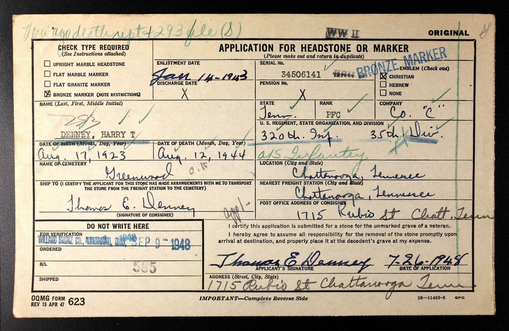 Pfc. Harry T. Denney, , son of Mr. and Mrs. T.E. Denney, Rubio Street, and husband of Mrs. Betty Privette Denney, Chamberlain Avenue, was reported missing in action yesterday by the War Department in a message to his wife. He has been missing since Aug. 11, with an infantry unit in France. Pfc. Denney entered the armed service in January, 1943, and has been overseas since last may. He is a graduate of Chattanooga Vocational School and he was employed hereb y the Volunteer State Life Insurence Company before he entered the army.