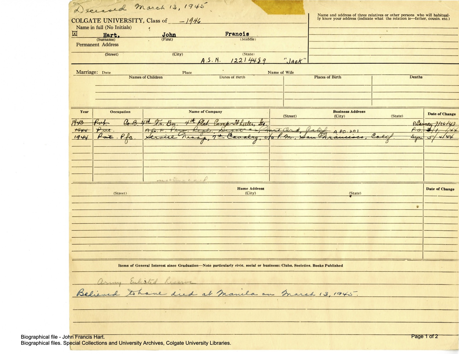 John Francis Hart, 21, was the son of James W. Hart and Margaret Corbett Hart of Oak Ridge, TN. A member of the Colgate University Class of 1946, he died in the Pacific of wounds sustained in Manila, the Philippines, March 15, 1945, while serving with the First Cavalry Regiment. The regiment was believed to have taken an active part in liberating internees of the Santo Tomas Camp in Manila.