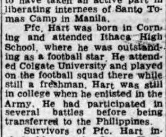 Hart was born in Corning, NY and entered college from Ithaca High School. At Colgate he was a member of Phi Gamma Delta and distinguished himself as a football and basketball player. As a member of the Army Enlisted Reserve, he received his call to active duty in May, 1943. After a period of training at Camp Wheeler, GA, he went overseas in December with a Cavalry Service Troop.
